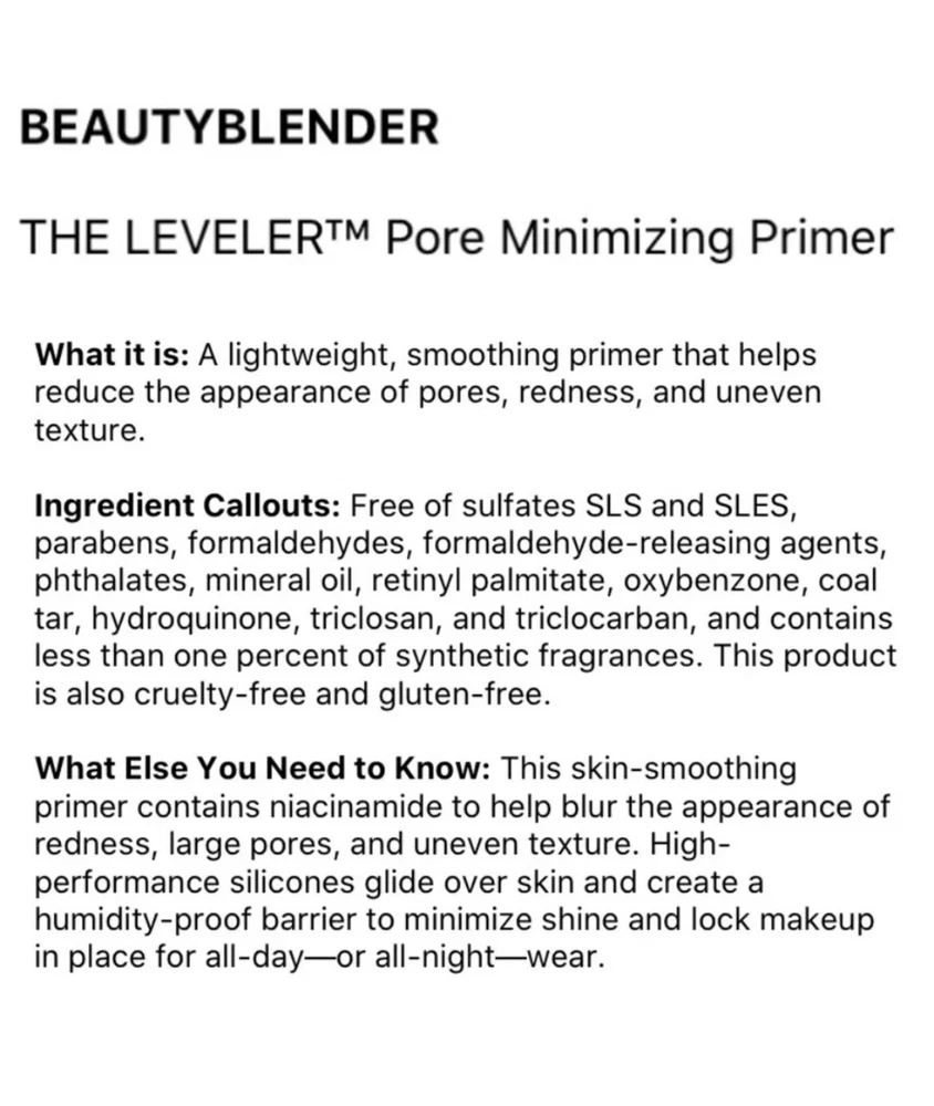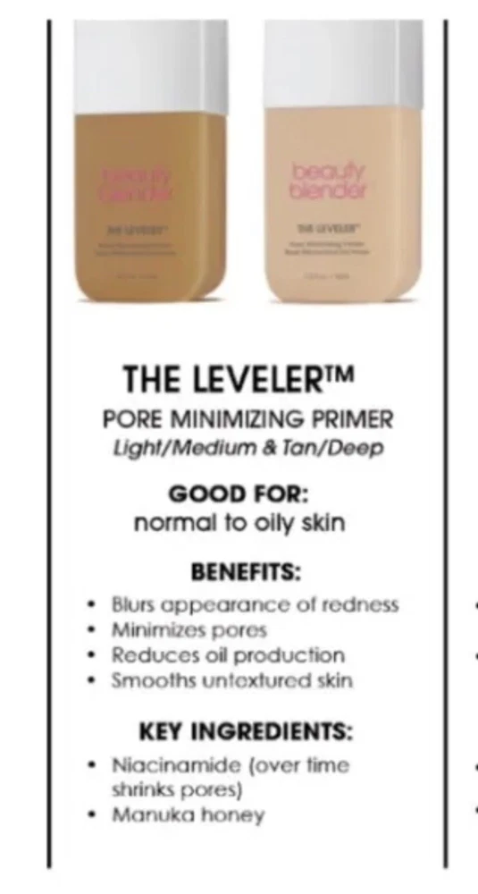 Beauty Blender The Leveler Pore Minimizing Primer Makeup Base in LIGHT - MEDIUM- Full Size. Brand New in box + (1) Free Makeup Sponge Blender (Color & shapes will vary as they are randomly chosen) Please Read - this listing only includes the primer in the shade light-medium. The brand, Beauty blender made these in 2 shades; Light- Medium and Tan-Deep . I also have the Tan-Deep Shade and the Beauty Blender Opal Primer too and will list shortly. If you have any questions feel free to message me. Listing includes this rare and discontinued Beauty Blender Primer / Makeup Base Full Sized brand new in the box and a makeup sponge . This skin smoothing primer contains niacinamide to help blur the appearance of redness, large pores, and uneven texture. High-performance silicones glide over skin and create a humidity proof barrier to minimize shine and lock makeup in place for all-day (or all night) wear. Unlike other mattifying primers, the lightweight texture never feels suffocating on skin and all your favorite formulas can be layered on without pilling. Available in Light-Medium and Tan-Deep. Recommended for normal to oily skin. Size: 1.0 oz / 30 ml Features & details Lightweight: Unlike other mattifying primers, the lightweight texture of the leveler never feels suffocating on the skin and all your favorite formulas can be layered on without pilling. this primer is perfect for makeup professionals or anyone just starting out. Color: beautyblender the leveler pore minimizing makeup primer comes in a light-medium color & tan-deep color and this long-lasting primer is great for anyone with normal to oily skin. High Quality: This high-quality skin smoothing primer contains niacinamide to help blur the appearance of redness, large pores and uneven texture. the leveler is cruelty free, vegan and made in the usa. Flawless base: To secure a flawless makeup application use a small amount and blend evenly on your face. concentrate on areas of dryness for added hydration. this primer is a great base for powder and liquid foundations, and concealer.