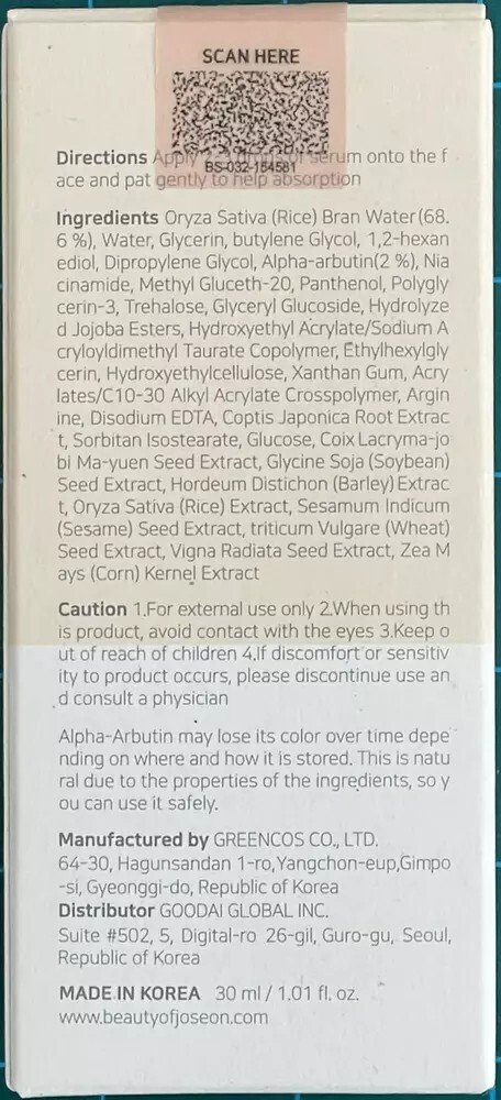 Beauty of Joseon Glow Deep Serum Rice + Alpha-Arbutin Description Item model number BOJ-J0011 Color Glow Deep Serum Product Dimensions 1.69 x 1.69 x 3.94 inches; 2.4 ounces Product Benefits Moisturizing,Nourishing Use for Skin, Face Skin Type Sensitive Skin,Dry Skin Scent Fragrance Free Brand Beauty of Joseon Manufacturer Beauty of Joseon Radiant Revelation: Unveil the beauty secrets of Joseon with the Glow Deep Serum, a meticulously crafted blend of rice and alpha-arbutin for unparalleled radiance. Address dark spots, discoloration, and acne scars with a powerful formula enriched with rice and alpha arbutin. Korean Skincare Essential: Elevate your skincare routine with the Beauty of Joseon Glow Deep Serum, a commitment to timeless k-beauty secrets that unlocks the path to glowing, flawless skin. Key Ingredients: Rice Water 68%: Moisturizing, hydration and glowing. Alpha-Albutin 2%: Radiance, dark spots, skin protection and pigmentation. Niacinamide: Skin tone, skin barrier and acne care. Deep Hydration, Rice Bran: Rice bran water moisturizes, enhances suppleness. Experience intense hydration alongside pigmentation correction for ultimate skin health. Tackle Skin Concerns: Suited for all skin types, even sensitive. Tackle uneven tone, dark spots, and dryness. Reveal luminosity and confidence in your skin's journey. Product Description 1 Less Melanin Production 2 Intense Hydration 3 Illuminates Skin Tone Key Ingredients 68% Rice Bran Water Rice has played a very important role as a staple food and skin care ingredient in Korean history. In the Joseon Dynasty, rice bran water was used like the toner of today, and was called Beauty Water. Rice bran is rich in amino acids and minerals, helping to moisturize dry skin. 2% Alpha-Arbutin Alpha-Arbutin works by inhibiting the tyrosinase activity that limits the melanin production in your skin. It is also known to have a 10 times greater effect than regular Beta-Arbutin. What skin types can use it? Suitable for all skin types. In particular, it is designed for concerns about dull skin tone and pigmentation. Since your skin may react sensitively to alpha arbutin if you have sensitive skin, it is recommended to perform a patch test before use. Please recommend the best match? For skin pigmentation, try layering with Revive Serum and Ginseng Essence Water that contain saponin-rich ginseng water. Can I use it both day and night? Yes, you can. However, alpha arbutin is vulnerable to light and heat, so it is recommended for use in the evening. Do I need to keep it refrigerated? Avoid direct sunlight and store it in a cool, dark place. Alpha-arbutin is vulnerable to light and heat, so please use it as soon as possible after opening. See Other Beauty of Joseon Serums Add to Cart Add to Cart Add to Cart Add to Cart Add to Cart Customer Reviews 4.4 out of 5 stars 7,188 4.4 out of 5 stars 147 4.4 out of 5 stars 7,188 4.4 out of 5 stars 7,188 4.4 out of 5 stars 7,188 Price $16.65 $ 16 . 65 $17.00 $ 17 . 00 $16.35 $ 16 . 35 $16.24 $ 16 . 24 $16.70 $ 16 . 70 Skin Concern Dark Spots & Uneven Tone Dark Spots & Uneven Tone Pores + Sebum Wrinkles + Dryness Acne + Breakouts Key Benefit Fades Dark Spots Improves Skin Tone Manages Sebum and Moisture Skin Vitality + Elasticity Soothing + Moisturizing Key Ingredients Rice +Alpha-Arbutin Centella + Vitamin C Propolis + Niacinamide Ginseng + Snail Mucin Green tea + Panthenol Vegan ✔ ✔ ✘ ✘ ✔ Cruelty-free ✔ ✔ ✔ ✔ ✔