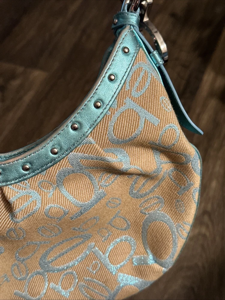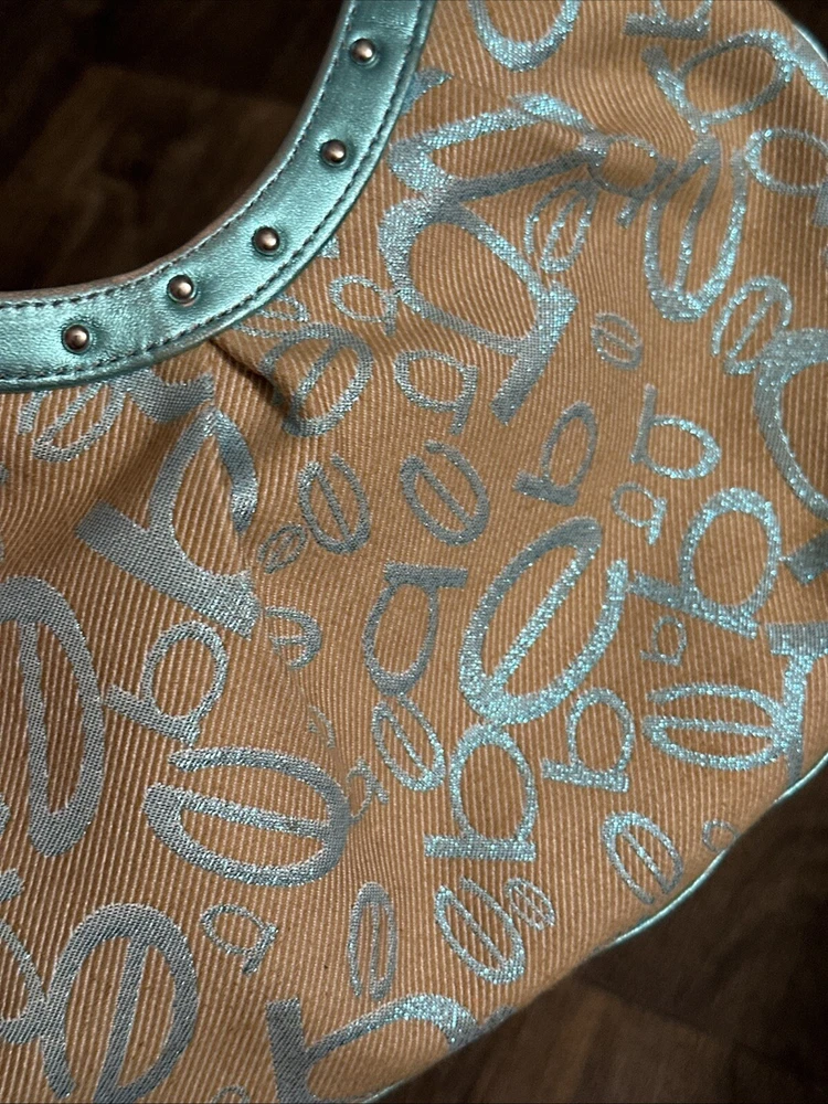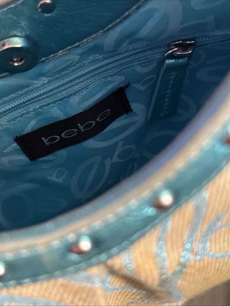 Elevate your style with this stunning Bebe shoulder bag. The exterior is made of high-quality manmade material in a beautiful tan color, with blue accents that add a pop of color to any outfit. The bag is studded with unique accents that showcase your personal style. Perfect for a night out or a day at the office, this bag is a must-have for any fashion-forward woman. The wooden-like handle adds a touch of elegance and comfort, making this bag perfect for all-day wear.