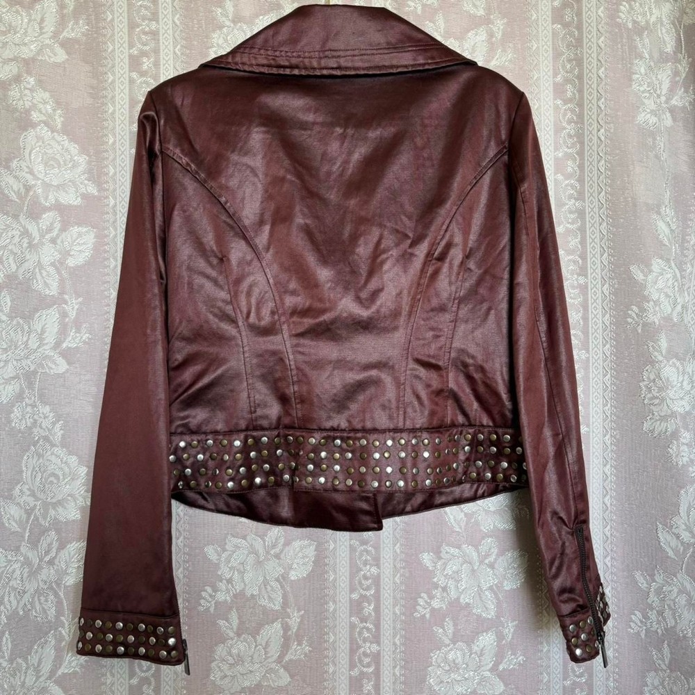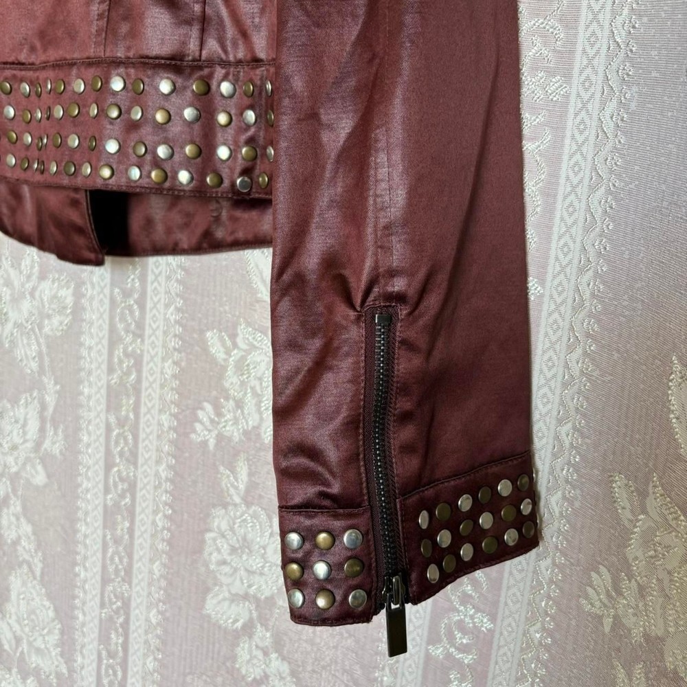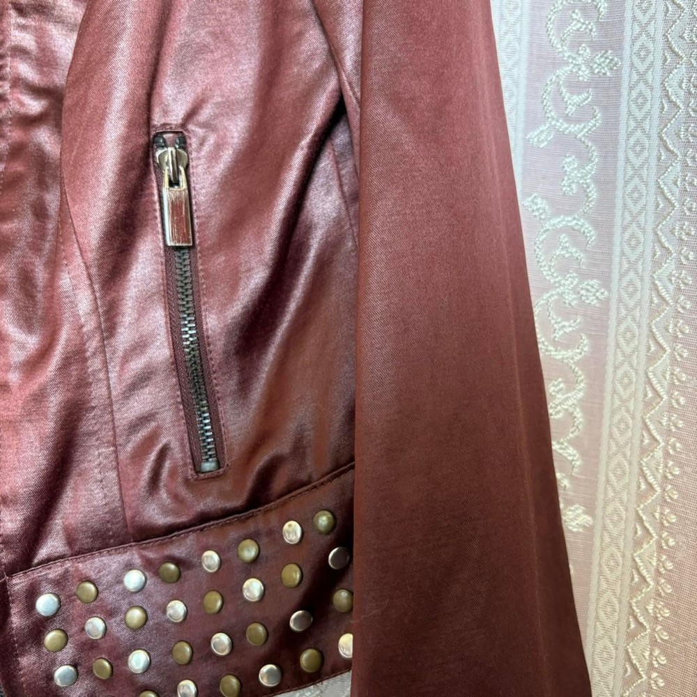 Beautiful Bebe moto style brown jacket with silver and gold studs, zipper sleeves and pockets, zipper front. Material is satin like. 70% cotton. Soft and cozy. Tag size M Pit to pit 19” Sleeves 24” Waist 19” Length (shoulder to hem) 20” #bebe #jacket #moto #brownmetallic #studs