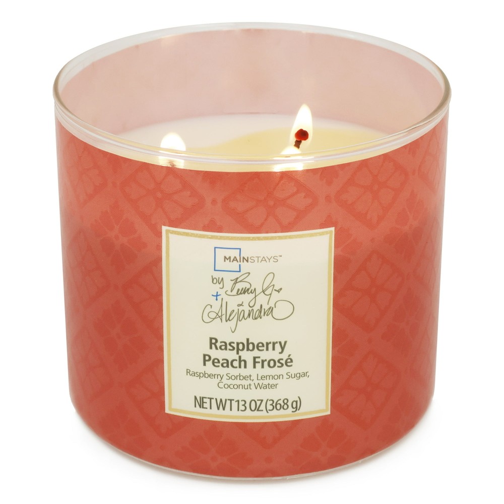 Mainstays by Becky G. & Alejandra 3-Wick Raspberry Peach Frose Candle, Orange Tile, 13 oz A fragrant candle that captures the enchanting aroma of raspberry sorbet, lemon sugar, and coconut water With 3 wicks for a steady and even burn Great for unwinding after a long day or setting the mood for a cozy evening Available in a variety of fragrances and decorative wrap designs Measures 4" x 4" x 3.75" Coordinate with other pieces from the Mainstays by Becky G. & Alejandra Collection