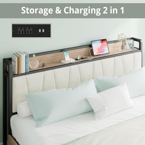 $ 47.52Bed Frame Twin Size with Charging Station and LED Lights, Upholstered Headboard
