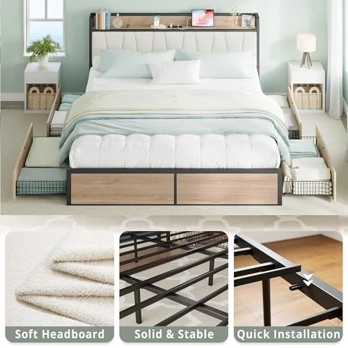 Return Policy Fast Delivery Trusted seller California King Bed Frame with 4 Storage Drawers, Platform Bed with Charged Headboard, Sturdy and Stable, No Noise, No Box Spring Needed, Easy to Install, Wood and Cream Product Description Sturdy and Only One Box: Robust metal slats reinforce the sturdiness and durability of the california king platform bed structure. Strong and stable support for a healthy back, reducing the risk of back pain and discomfort Storage and charging : Storage headboard with outlets that make charging and common small items such as phones, glasses, and books within easy reach Practical Storage Bed: 4 large storage drawers can provide extra storage space without taking up extra space helping you keep your bedroom neat and organized Rustic California King Bed: Its neutral color and clean lines make it the perfect complement to any decor style. Whether you're looking to upgrade your bedroom or furnish a guest room, this bed frame is the perfect choice Save Time: Putting together this california king size bed frame is a breeze with the included instructions, tools, and easy to handle wrenches and bolts Shipping Returns Payment Shipping Shipping is FREE to all addresses other than APO/PO boxes in the lower 48 states. All our stock ships from US-based warehouses. Shipped via USPS or UPS (depending on location and package weight) Unless stated otherwise, all orders will ship within 24-72 hours of your payment being processed. Check our feedback to see the great reviews of FAST shipping we offer. Returns Seller does not accept returns Payment We currently accept payment via eBay managed payments only. Once payment is cleared, we will dispatch your shipment within 1-3 business days. Please refer to the "Shipping" tab for more information regarding shipping speed to your destination.