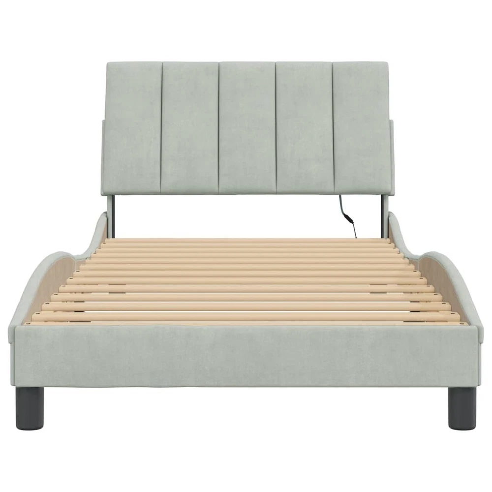 Size: Twin Get a better restful night's sleep from this bed frame with LED lights! It makes a welcoming addition to any bedroom. Soft velvet: Velvet is a soft and comfortable fabric that feels nice against the skin. Plywood slats: The plywood slats provide good weight distribution, ensuring that the mattress stays in place with every twist and turn of your body during sleep. Excellent support: The headboard pillow is stuffed with foam for ultra-soft and optimal comfort, providing you with excellent back support while you're sitting up in bed to read or watch TV. Colorful LED strip: Bring playfulness into darkness with colorful LED lights! The hook and loop fasteners on the back of the headboard cushion can be used to secure the LED lights. Waved side design: The waved look of the bed frame is stylish and sophisticated, adding a modern and elegant touch to your decor, making it the focal point of your bedroom. Good to know: A mattress is not included with this bed. We do offer a various selection of mattresses. You can check our shop for a matching mattress. The product has a USB connector that requires a certified 5V USB power source (not included). Bed frame: Color: Light gray Material: Velvet (100% polyester), metal, solid pine wood, plywood, engineered wood Overall dimensions: 81.9" x 41.3" x 29.3" (L x W x H) Suitable mattress size: 39.4" x 74.8" (W x L) Twin (mattress not included) Headboard cushion: Color: Light gray Material: Velvet (100% polyester) Filling material: Foam Dimensions: 39.4" x 1.2" x 17.7" (L x W x H) LED strip: Length: 21.7" Voltage: DC 5 V USB cable length: 55.1" Power cable length: 11.8" IP rating: IP65 Range name: Hanko Delivery contains: 1 x Bed frame 1 x Headboard cushion 1 x LED strip California Proposition 65