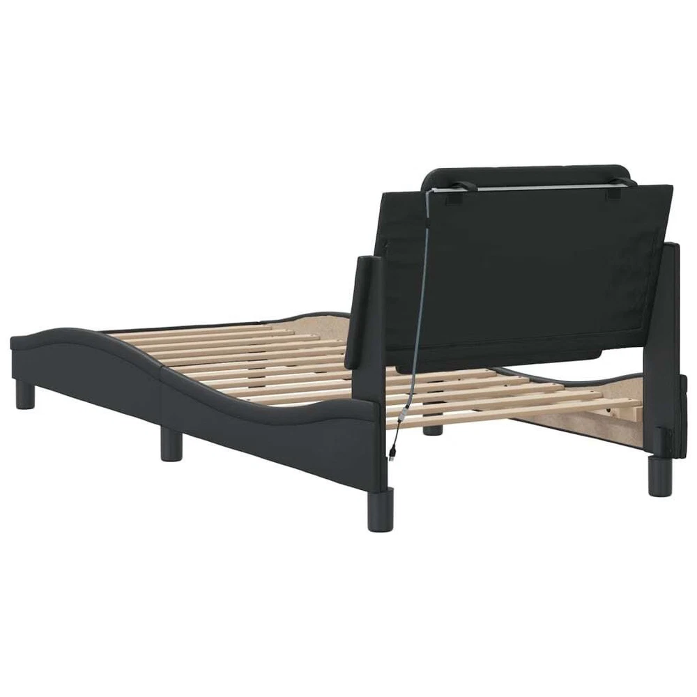 Size: Twin Get a better restful night's sleep from this bed frame with LED lights! It makes a welcoming addition to any bedroom. Durable faux leather: Premium faux leather is a highly durable material. It helps prevent stain, making it easy to clean with a damp cloth. The smooth surface also gives a luxurious look and the beauty of real leather. Plywood slats: The plywood slats provide good weight distribution, ensuring that the mattress stays in place with every twist and turn of your body during sleep. Excellent support: The headboard pillow is stuffed with foam for ultra-soft and optimal comfort, providing you with excellent back support while you're sitting up in bed to read or watch TV. Colorful LED strip: Bring playfulness into darkness with colorful LED lights! The hook and loop fasteners on the back of the headboard cushion can be used to secure the LED lights. Waved side design: The waved look of the bed frame is stylish and sophisticated, adding a modern and elegant touch to your decor, making it the focal point of your bedroom. Good to know: A mattress is not included with this bed. We do offer a various selection of mattresses. You can check our shop for a matching mattress. The product has a USB connector that requires a certified 5V USB power source (not included). Bed frame with headboard: Color: Black Material: Faux leather (75% polyvinylchloride, 5% cotton, 20% polyester), metal, solid pine wood, plywood, engineered wood Overall dimensions: 81.9" x 41.3" x 29.3" (L x W x H) Suitable mattress size: 39.4" x 74.8" (W x L) Twin (mattress not included) Headboard cushion: Color: Black Material: Faux leather (75% polyvinylchloride, 5% cotton, 20% polyester) Filling material: Foam Dimensions: 39.4" x 1.2" x 18.9" (L x W x H) LED strip: Length: 22" Voltage: DC 5 V USB cable length: 59.1" Power cable length: 11.8" IP rating: IP65 With scissor cuttable symbol Range name: Zadar Assembly required: Yes Delivery contains: 1 x Bed frame with headboard 1 x Headboard cushion 1 x LED strip California Proposition 65