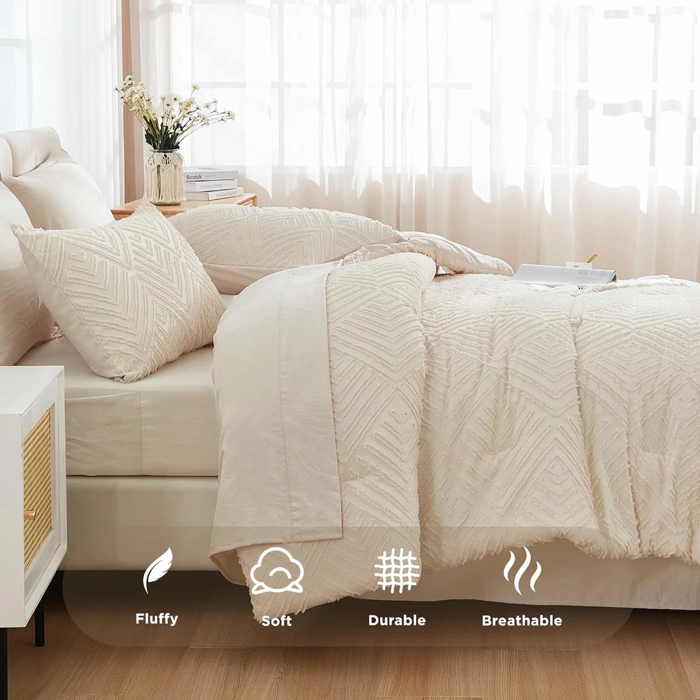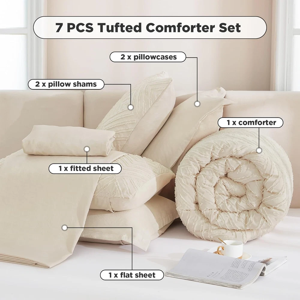 Store New Arrivals Add to Favorite View Feedback Contact Fast deliveries to the customer's home Quality customer service John Make the customers happy! Bed in a Bag King Beige- 7 Pieces King Size Comforter Set Bedding Comforter Sets, Tufted Lightweight Fluffy Bed Set with Comforter, Sheets, Pillowcases & Shams for All Season Description Effortless Comfort: Premium filling covered in brushed microfiber offers exceptional softness in all seasons. Cozying up in a beautiful boho comforter set is one of the favorite little luxuries—it is the easiest way to make even the simplest everyday moments a little more glamorous. Unique Design: Andency beige king comforter set with sheets feature geometric textured patterns. The elegant simple yet sophisticated tufted design gives your bedroom a nice update and a boho modern chic look. Brighten up your home with a relaxed and slouchy vibe. Thoughtful Details: The stitching and seams are all straight and even. The fabric feels soft and slick, almost silky, but not quite. High-density fabric guarantees that it will not rip or shrink easily. Besides, our fitted sheet has an elastic 14" deep pocket which will fit almost any mattress. Bed in a Bag King Includes: 1 comforter 104'' x 90'', 2 pillowcases 20'' x 40'', 2 pillow shams 20'' x 36'', 1 fitted sheet 78'' x 80''+14'', 1 flat sheet 108'' x 102''. Warm tips: The bedding comforter sets 7 pieces will be wrinkled just after opening the package. Please kindly wash it and tumble dry on low before the first use or put it in the sun and pat it gently for fluffy. Easy to Clean: Machine wash in a gentle cycle with cold water, and tumble dry on low heat if needed. After washing and drying it, it came out perfectly! No need to iron or anything. You can keep the beige bedding looking like new with minimal effort, making it perfect for busy lifestyles. Product description 1 Soft & Smooth Material 2 Tufted Geometric Texture 3 Four Corner Loops 4 360° All Around Elastic 1 Beige 2 Emerald Green 3 White 4 Burnt Orange Fitted Sheet Depth 35.56 Centimeters Style Bohemian Included Components Comforter, Pillow Shams, Pillowcases, Flat Sheet and Fitted Sheet Color Beige Pattern Geometric Material Polyester Fabric Type Microfiber Item Weight 12.25 pounds Theme Bohemian Size King (104"x90") Pillowcase Length 20 Inches Seasons All Package Dimensions 14.25 x 11.54 x 6.73 inches Product Care Instructions Machine Wash Number of Pieces 7 ABOUT US We offer the best prices around on high quality products. Our E-store includes media such as books, movies, music and games while offering electronics, toys, sporting apparel, clothing, tools, general home, garden items and more. SHIPPING We are always working hard to ensure your package arrives as soon as possible. Please understand that some factors like weather, high postal traffic, and the performance of shipping companies are outside of our control. We offer free shipping to the lower 48 states and ship within 2 business days of payment, usually sooner. We do not accept P.O. Boxes. Please provide a physical address. For shipping outside of the continental USA, we only use eBay's Global Shipping Program. The item is shipped to KY and then sent to the rest of the world. International customers are responsible for all duties and taxes. Continue to 'check out' to calculate costs for shipping the item to your country. Messages regarding eBay's Global Shipping Program MUST be directed at eBay EXCLUSIVELY. RETURNS We offer a 30-Day Return Policy on items in which you are not completely satisfied with. You have the option of a full-refund or an exchange of the item. No returns are available on items shipped outside of the USA PAYMENT We accept PayPal. CONTACT US This page content is yet to come Please ad us to your favorite seller and visit again later Thank You CUSTOMER SATISFACTION We try our very best to make sure every customer is completely satisfied. If there's a problem, message us! We're happy to help. WE ACCEPT