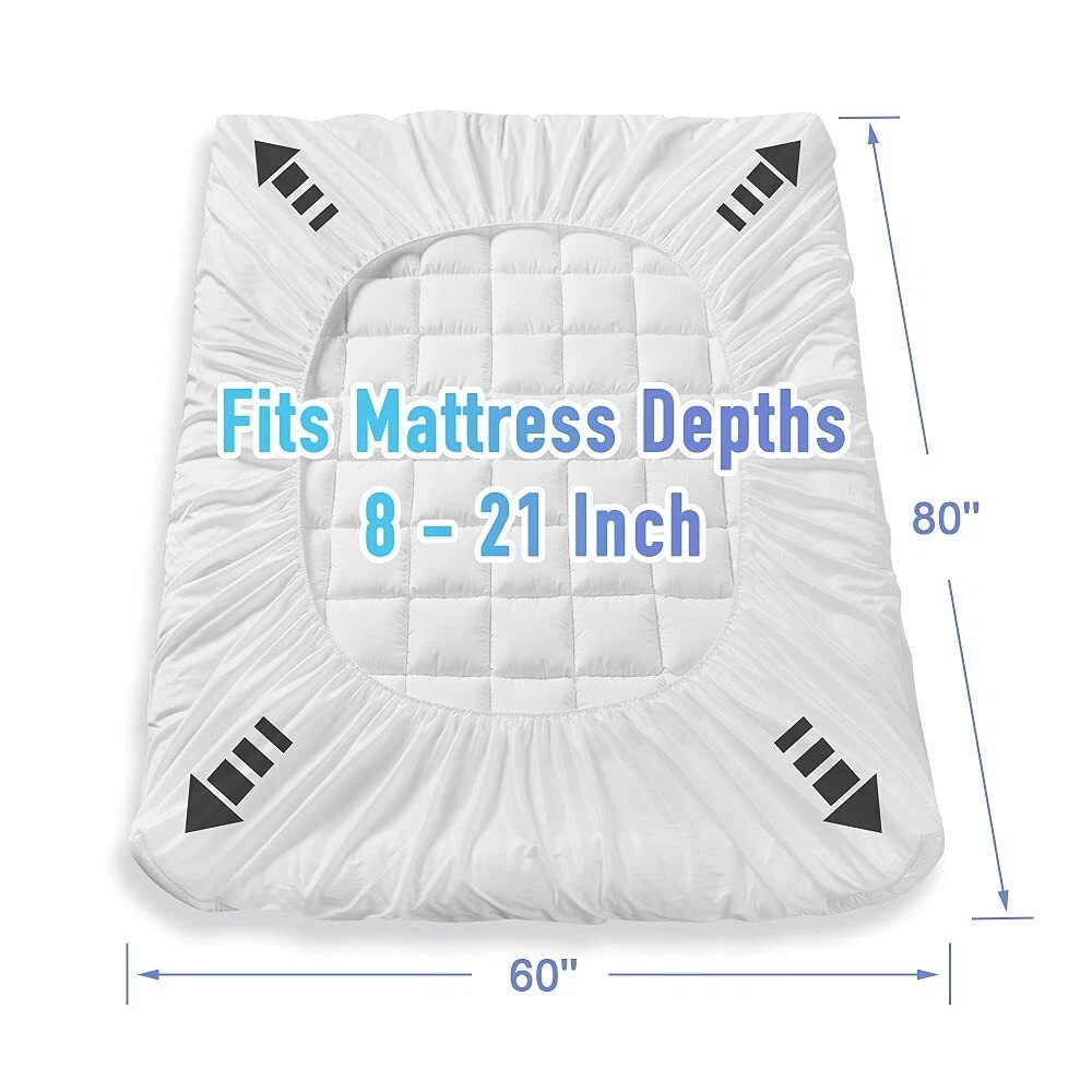 Fluffy & Soft Mattress Pad: Queen Mattress Pad (60''x80'') with microfiber top layer and the new designed microfiber filling (50% 3D+50% 6D) provide softness and extra resilience, that giving you cozy feel and most relaxing sleep. Cooling Breathable Mattress Pad: The microfiber top makes the surface feel cooling and breathable, the microfiber filling (50% 3D+50% 6D) increases circulation and breathability. It will provide you a cozy and breathable sleeping environment, make you feel comfortable without extra heat and sweat. Quilted Fitted Mattress Pad: Compared to the normal diamond quilting seam, this quilted fitted pad with new shape is more supportive, soft and durability. Rebound well after washing, quick drying and wrinkle resistant features help save your time and your electric bill. Mattress Pad with Deep Pocket: The 360° fabric pocket sides can be easily stretched to fit mattresses up to 8" -21" thick. It will hold tight on all mattress types, whether it's a regular mattress, a waterbed, or memory. It will never slide no matter how you twist and turn in your bed. Machine Washable Mattress Pad: Machine washable, under gentle cycle with cold water, tumble dry low. Please DO NOT iron, DO NOT dry clean.