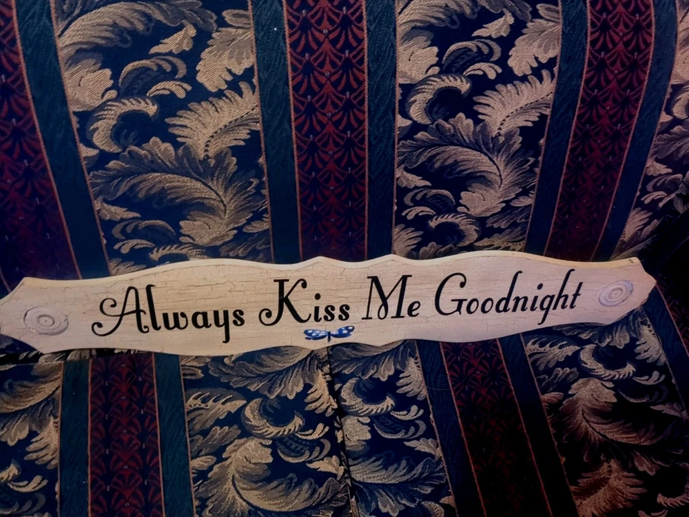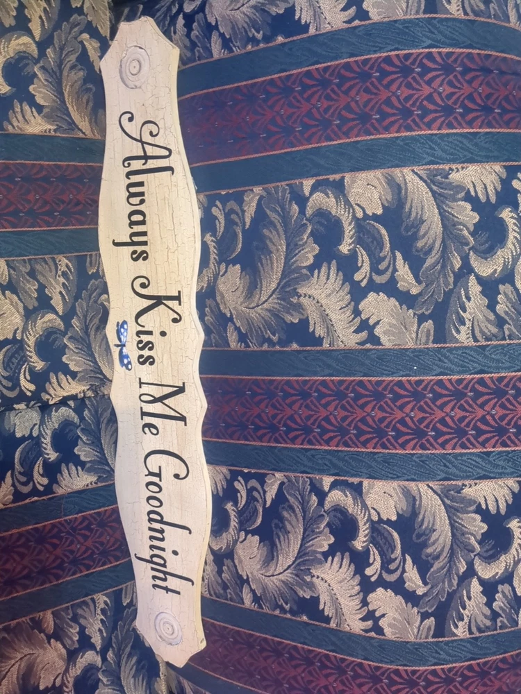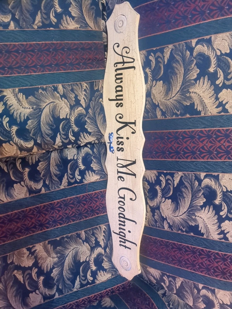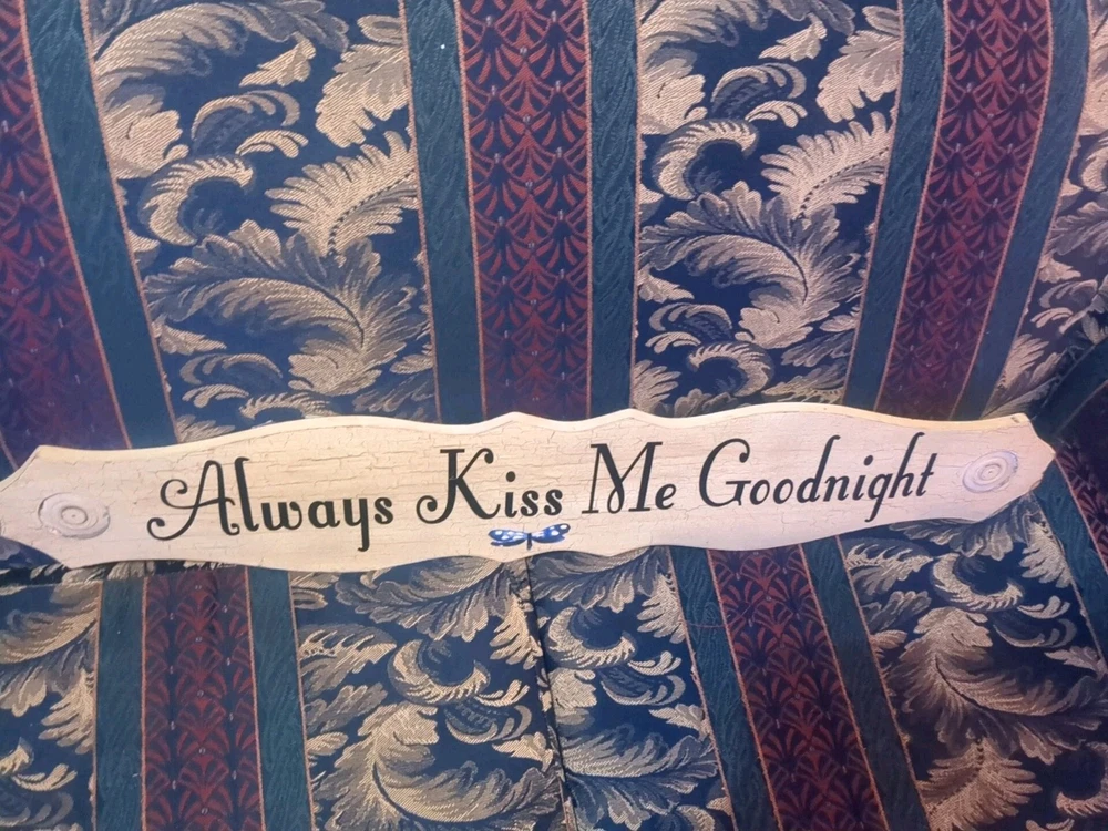 This decorative hanging plaque features the phrase "Always Kiss Me Goodnight" and is designed for bedroom decor. With a height of 6.5 inches, length of 35 inches, and width of 5 inches, this plaque is perfect for adding a touch of charm to your living space.