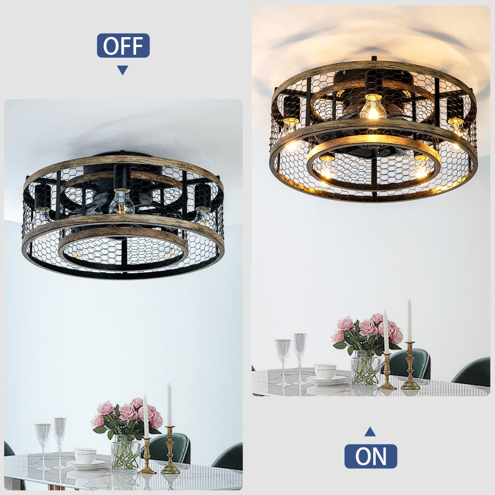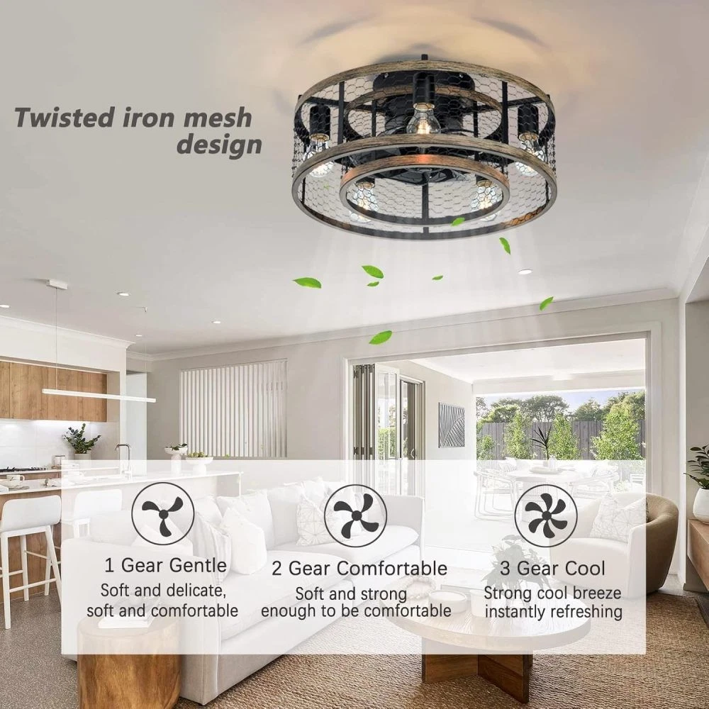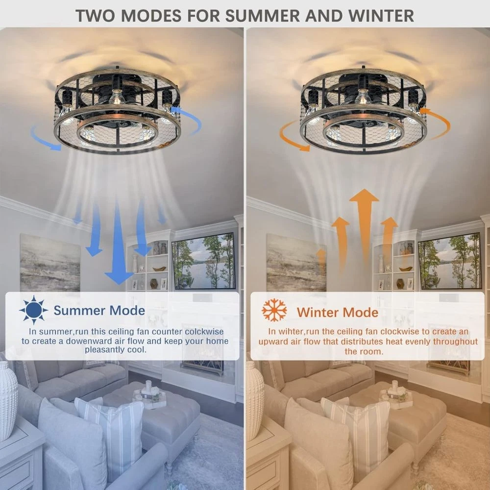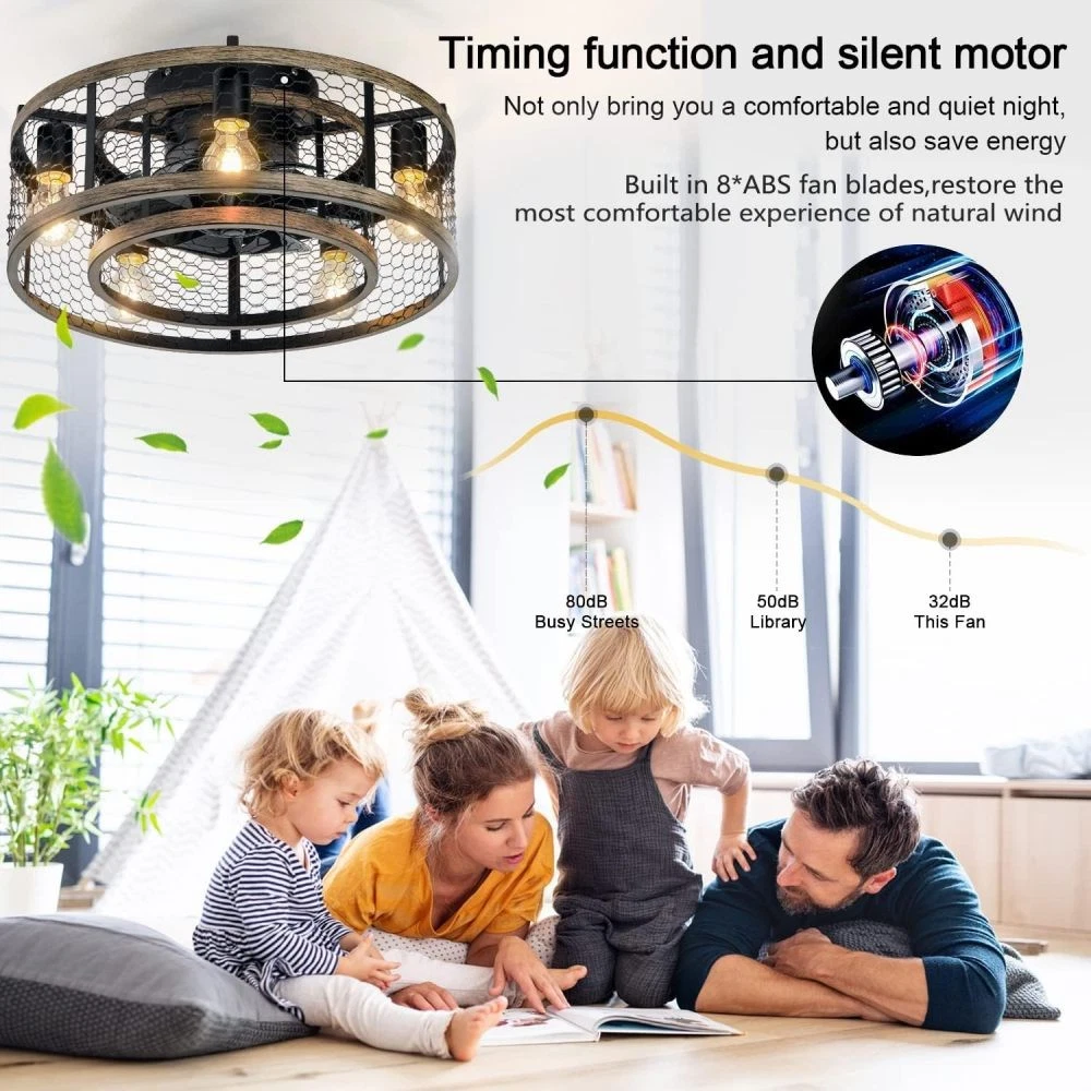đ Key Features & Why Youâll Love It 2-in-1 Chandelier & Ceiling Fan Design This caged fan blends a stylish iron chandelier aesthetic with functional airflow, adding a regal, hazy charm to bedrooms, living rooms, dining rooms, or kidsâ rooms. Requires 5 x E12 bulbs (max 25W each, bulbs not included ). Convenient Remote Control Operation Easily adjust fan speed and turn lights on/off from anywhere in the roomâno need to reach for switches. Quiet Reversible Motor for Year-Round Use Enjoy nearly silent operation while switching airflow directionsâcool breezes in summer and heat distribution in winter. Easy Installation in Minutes Most components come pre-assembled. Follow simple steps to install this low-profile fan quickly, with a semi-open design that makes bulb changes a breeze. đ Product & Package Details Assembled Dimensions : 20.00â L x 20.00â W x 10.00â H (compact size ideal for various room sizes). Product Weight : 10.45 lbs (sturdy yet easy to handle). Package Dimensions : 20.50â L x 20.50â W x 11.40â H Package Weight : 12.10 lbs (securely packed for transit). ⨠Hassle-Free Shopping Guarantees 1-Year Warranty : We stand behind our product! Enjoy a 1-year warranty against manufacturing defectsâweâll help fix or replace if anything goes wrong. 30-Day Free Return & Exchange : Not satisfied? Return or exchange within 30 days for free (just keep the product in original conditionâno questions asked). đ Perfect Gift for Homeowners & Design Enthusiasts This caged ceiling fan is a thoughtful gift for anyone upgrading their spaceâideal for housewarmings, birthdays, or as a stylish blend of function and decor. Order now and transform your beauty space-with our warranty and free return policy, you have nothing to lose!
