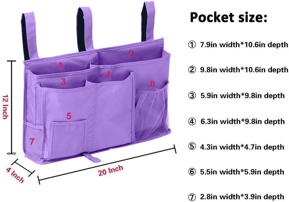 Shape: Rectangular Type: Bedside Organizer Bag Item Length: 3.9"D x 19.2"W x 3.9"H Country of Origin: United States Number of Items in Set: 1 Number in Pack: 1 Material: oxford Item Height: 3.9"D x 19.2"W x 3.9"H Color: Purple Size: Large Item Width: 3.9"D x 19.2"W x 3.9"H Brand: Unbranded