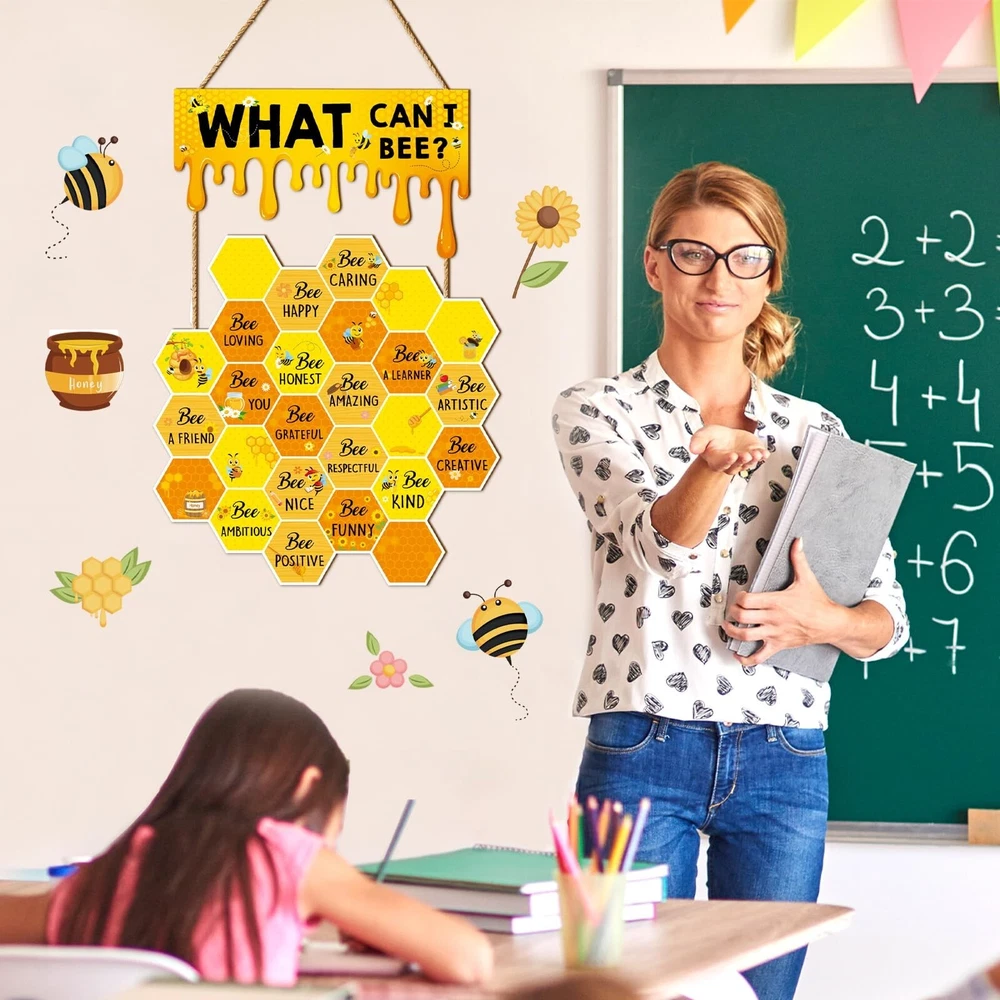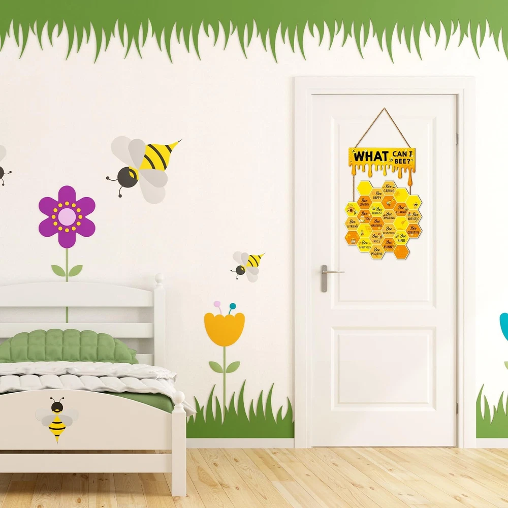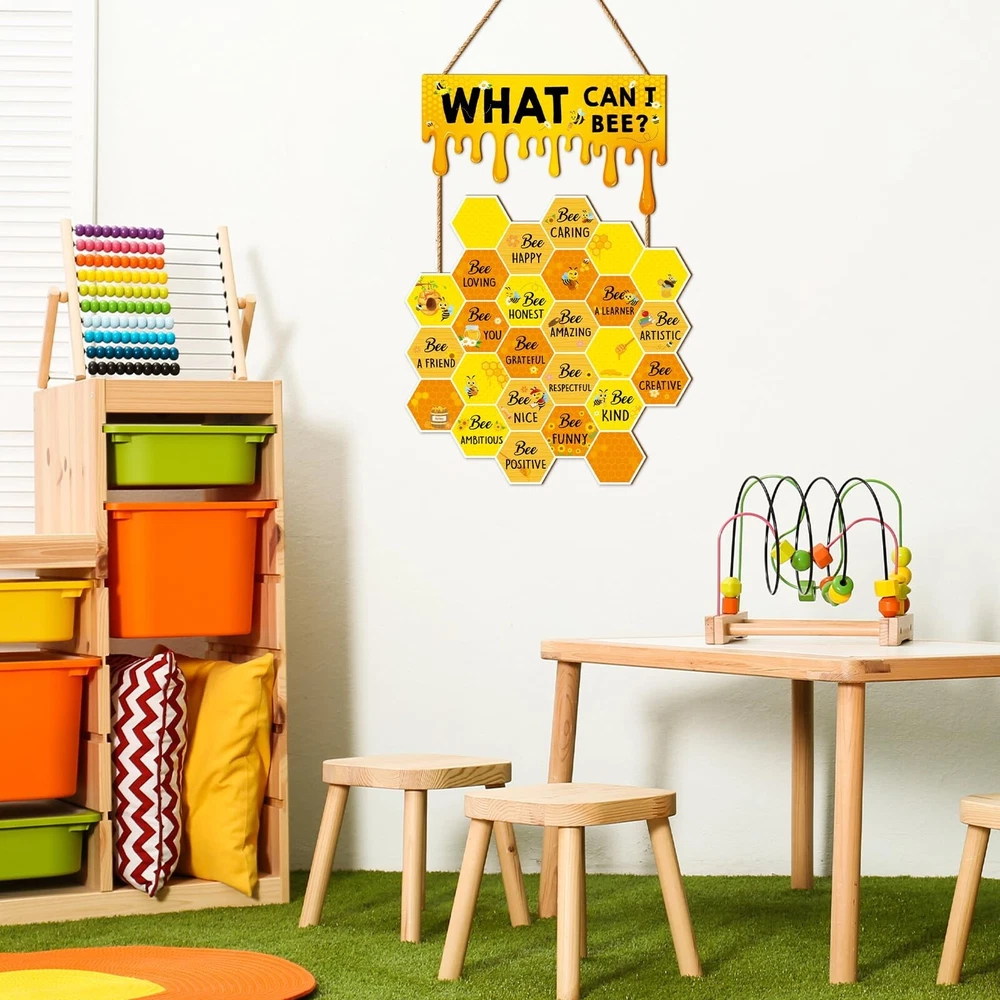 Bee Wall Decor Hive Rules Inspirational Wall Art Summer Wooden Hanging Sign for Back to School Classroom Office Bedroom Home Decor Product Details Style: Bee Brand: JarThenaAMCS MPN: J1182 UPC: Does not apply EAN: Does not apply Color: Yellow Brand: JarThenaAMCS Material: Wood Theme: Animal Recommended Uses For Product: decorating walls, windows, front doors, fences, classrooms, bedrooms, play rooms, living rooms, and offices; birthday parties, school activities, and bee-themed parties; gift for classmates, neighbors, friends, teachers, and others See more Product Dimensions: 4.7"L x 10"W Shape: Rectangular Style: Bee Pre-printed: What Can I Be?, Be Happy, Be Thankful, Be Grateful, Be Loving, Be Honest, Be Respectful, Be Brave, Be Creative, Be Positive, Be Appreciative, Be Humble, Be Patient, Be Forgiving, Be Kind Included Components: 1 piece of bee wall decor Item Weight: 7.8 ounces Manufacturer: JarThenaAMCS Country of Origin: China Item model number: J1182 YOU WILL GET: 1 piece of bee wall decor is included in the package, lovely and eye-catching, perfect for decorating classroom, bedroom, office and more. You can also share with your friends, classmates or families. ADORABLE DESIGN: Our wooden hanging sign feature with lovely hive and honey design, decorated with bee and sunflower, also printed with inspirational words, delicate and encouraging, bright color and vivid pattern add a fresh natural look to your classroom wall decor. GOOD MATERIAL: Made of durable wood, safe and odorless, not easy to corrode or break, reusable and can be kept for a long time, with good texture and smooth touch, make them look more exquisite. WIDE APPLICATION: Ideal to decorate wall, window, front door, fence, etc., great for classroom, bedroom, play room, living room, nursery and office, perfect for birthday party, school activity and bee themed party, creating a cheerful atmosphere. WONDERFUL GIFT: A fancy gift for your classmates, neighbors, friends, teachers and so on, to give them your best wishes and blessings. Use multiple accents at home or in the classroom, from parties to classrooms. Features: Delicate design: Delicate wooden door sign, patterned with honeycomb, printed with inspirational words, adding more glamour to your classroom or home decor. Ideal decor: Safe and reusable. Ideal to decorate wall, window, front door, fence, etc., great for classroom, bedroom, play room, living room and office. Specifications: Size: shown in the picture Material: wood Package includes: 1 x Wooden Wall Sign