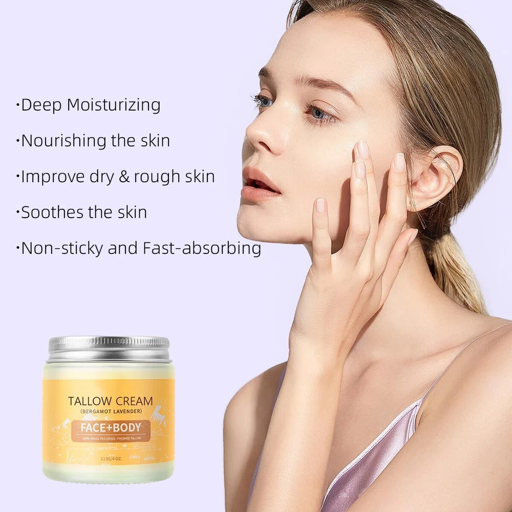 Hydrating and Nourishing:The Organic beef tallow blam is designed to soothe and improve cracked, dry skin.This body moisturiser's rich formula provides essential hydration and nourishment, leaving your skin with a healthy glow Natural Ingredients:The Tallow face moisturizer is made of high-quality formula, rich in tallow,vitamin,olive extract and other formula,can gently moisturize and hydrate the skin,provide your skin with long-lasting moisturizing, elastic and rejuvenating All Purpose Skin Balm:Handmade tallow balm is an all-in-one skin balm that can be used as a moisturizer, toner, lotion, foot & hand cream, sunburn soothing cream, and so on.Delivering comprehensive hydration for soft, supple skin Suitable For All Skin Types:Our tallow honey balm body lotion pampers your skin clean and refreshed.The tallow honey balm face moisturiser is safe for all skin types. If you have dry skin,face moisturiser for dry skin may take longer.For normal skin type, about 15 mins Perfect Gift for Women: Our tallow face moisturizer is a natural product with excellent skin care effects, tallow face moisturizer suitable for both male and female adults, beef tallow for skin is the best gift for your own husband, wife, male and female friends Product Specification Product Name: Butter Cream Butter Moisturizer Grass-fed Butter Moisturizer Face Cream Moisturizer Butter Honey Moisturizer Body & Face Moisturizer Packaging Material: Carton Ingredients: Grass-fed beef tallow and olive oil Product Type: Butter Cream Shelf life: 3 years Product Characteristics PREMIUM QUALITY INGREDIENTS: Butter & Honey Skin Balm is made from organic grass-fed beef tallow and olive oil. ALL-PURPOSE BUTTER BALM: This natural skin care product soothes dry and chapped skin, providing essential care and moisturization to leave your skin nourished and revitalized. FACE & BODY SKIN CARE: Sapium Honey Moisturizing Cream is a multi-purpose, multi-functional product that can be used as a face, body, hand and foot cream to provide complete moisturization to the skin, leaving it soft and supple. SUITABLE FOR ALL SKIN TYPES: This Tallow Honey Body Cream is free from potentially irritating essential oils and is made with natural ingredients that are gentle and non-irritating. Safe for sensitive skin, it provides optimal moisturization and nourishment for healthy, radiant skin. SAFETY WARNING: Avoid contact with eyes and keep away from open flame or direct heat. SKIN CARE DAY: Use it as part of your daily skin care routine to improve skin problems.