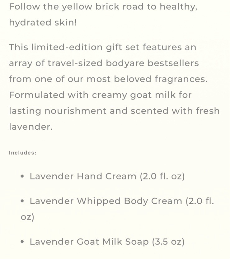 Brand new/unused set of three lavender products from Beekman. Includes hand cream, whipped body cream, and bar soap. Box shows mild damage.