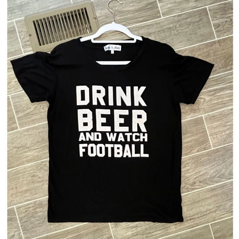 Football ladies here’s your shirt. Says drink beer and watch football. It’s black with white Writing. Short sleeve T-shirt. Excellent condition I think one once. Made by twine and stark. It is made in the USA. Size small. 96% rayon 4% cotton. Nothing wrong no flaws no tears no stains.It says it all: Drink Beer, Watch Football!