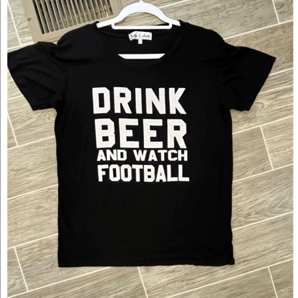 Football ladies here’s your shirt. Says drink beer and watch football. It’s black with white Writing. Short sleeve T-shirt. Excellent condition I think one once. Made by twine and stark. It is made in the USA. Size small. 96% rayon 4% cotton. Nothing wrong no flaws no tears no stains.It says it all: Drink Beer, Watch Football!