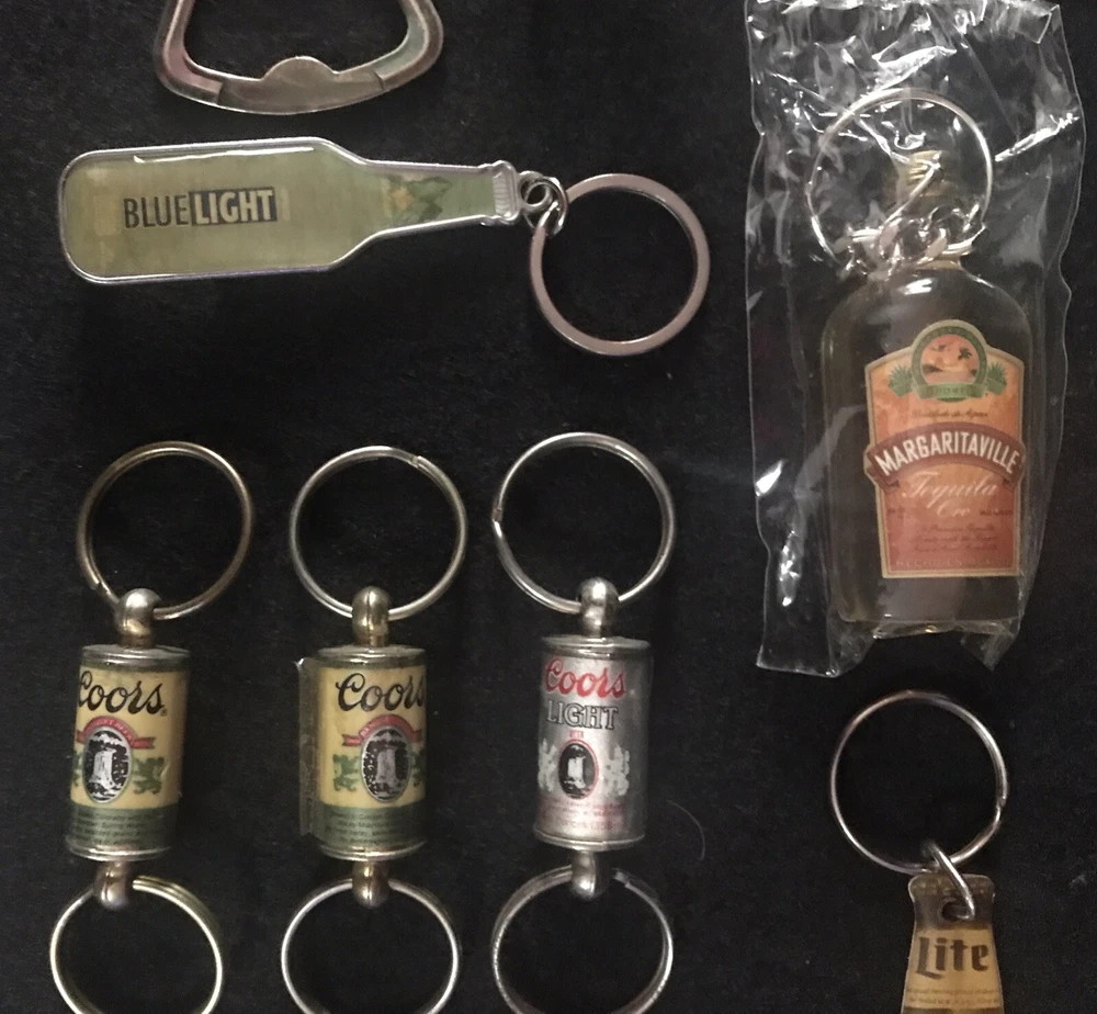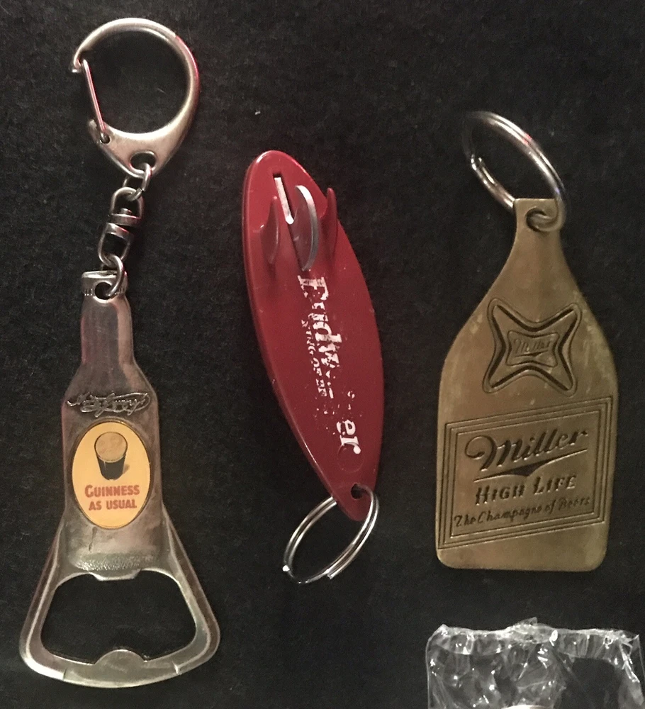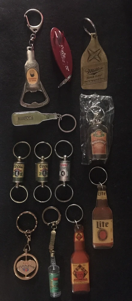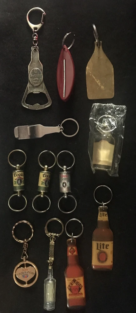 Beer Keychains Bottle Opener Lot Miller Budweiser Coors Guinness Red Dog Corazon Lot of 12: 1) Guinness As Usual (Handmade in Ireland) Keychain / Bottle Opener 2) Miller High Life (Solid Brass) 3) Labatt Blue Light Keychain / Bottle Opener 4) Miller Lite 5) Tequila Corazon (gold heart spinner) 6) Red Dog 7) Wolfschmidt Vodka 8) Budweiser Surfboard Keychain / Bottle Opener 9) Coors Light (double ended) 10) Coors (double ended) 11) Coors (double ended) 12) Margaritaville Tequila (New) Please see pics for details and overall condition. Thanks for looking and supporting our small business. We are blessed to be working from home, with the best coworkers we could ever ask for, each other! ❤️With love and blessings, (-: Dee & Chi :-)