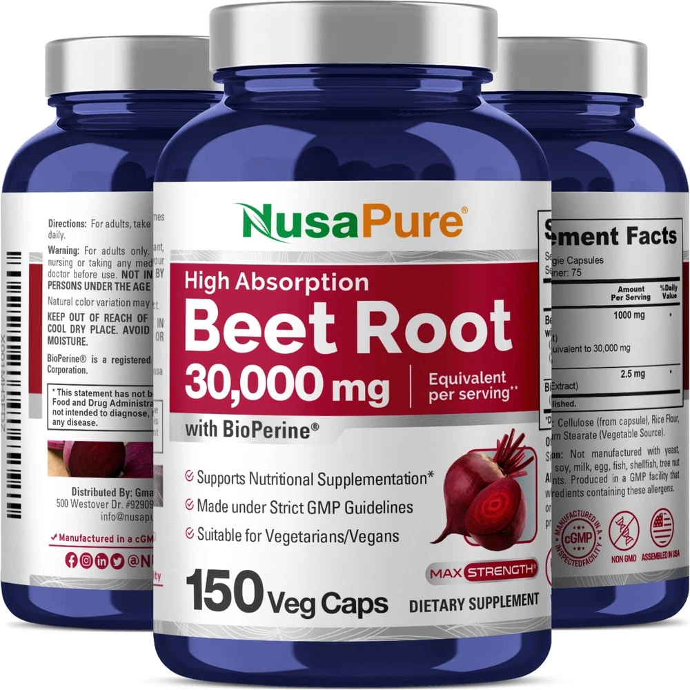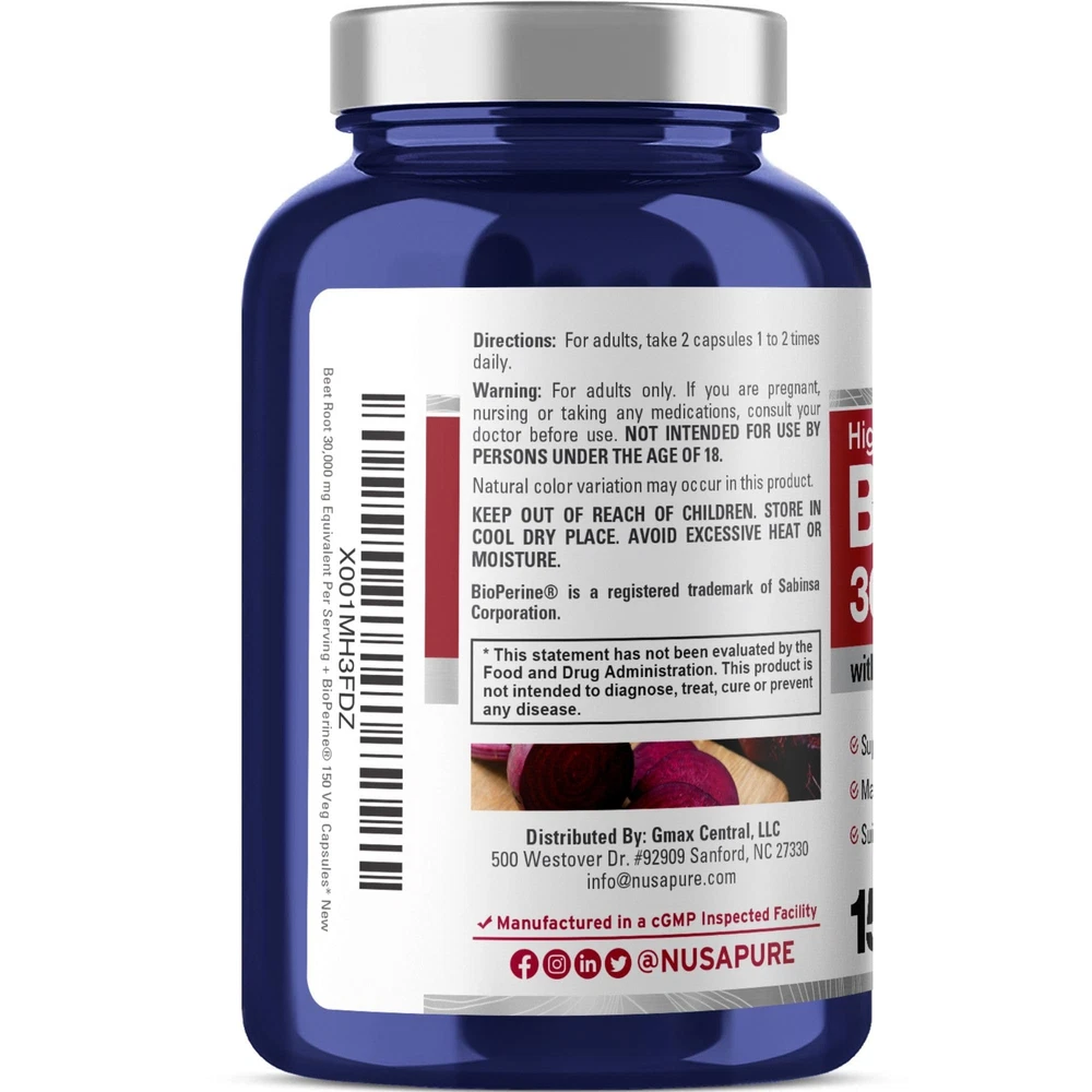 Our vegan formulation contains organic beet root .Plant based formulation suitable for Vegan and Vegetarian diets.Each serving delivers 1,100 mg. Serving is 2 . 200 veggie caps for a 100 day supply.Manufactured in the USA in a cGMP registered facility with the highest standards.Non-GMO and Gluten Free Beet root is considered as a" super red food": This herb has gained popularity as a "superfood" for its abudance of strong nutrients*.Beets are indigenous to the Mediterranean where they reside along the coastline. They’re often referred to as “Sea Beets” and were first cultivated for their edible leaves*. It was then discovered that the Taproot part of the Beet Plant was also valuable and especially rich in natural Vitamins, Minerals, Nitrates and Fiber*. High Absorption Beet Root 30,000mg equivalent per serving. Bioperine. Extract 30:1 Beet root extract with 4% Nitrates. Vegan/Vegetarian. Serving is 2 . 150 veggie caps / 75 servings. Our formulations are crafted with quality ingredients and care. Manufactured in a cGMP registered facility with high standards.
