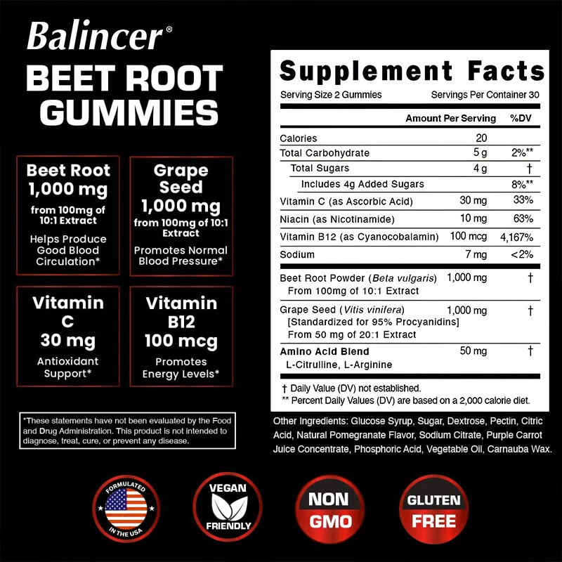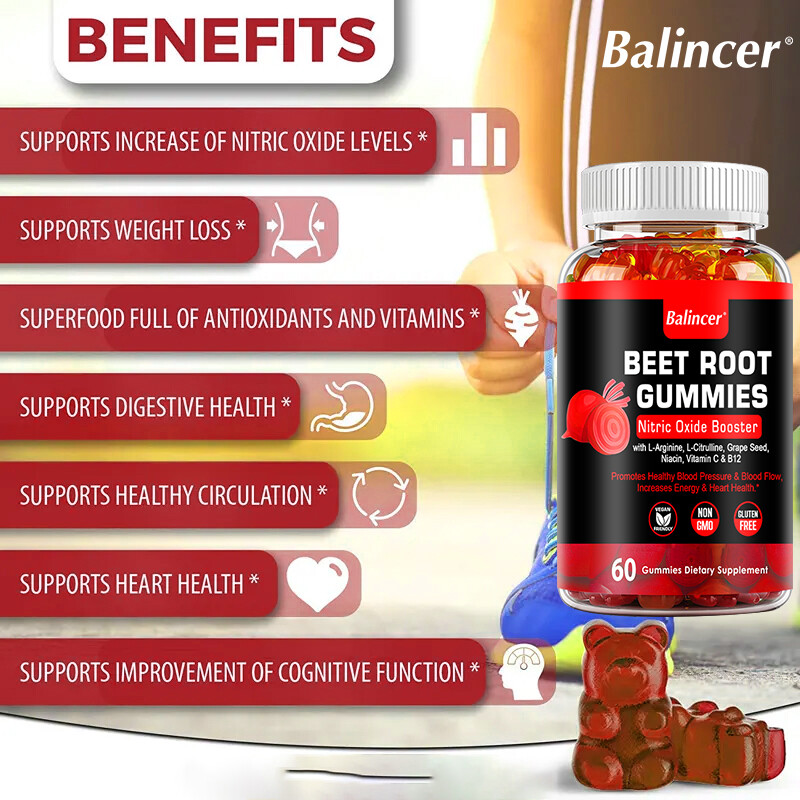 Key Feat ures : Supports Increase Of Nitric Oxide Levels Supports Weight Loss Superfood Full Of Antioxidants And Vitamins Supports Digestive Health Supports Healthy Circulation Supports Heart Health Supports Improvement Of Cognitive Function Descri ption : Nature’s Superfood: Beet root (Beta vulgaris) is an iconic red superfood that grows abundantly throughout North America and Europe. It is a natural source of vitamins and minerals and other beneficial nutrients, making supplementation a key form of support. Beet root also provides naturally-occurring nitrates, which as a precursor to nitric oxide in the body.* Supplementing with Beet Root: Beet root is featured in many supplements including bulk powder, capsules, pills, liquid drops, tea, juices, chewable tablets, and more. Now there is a whole new way for adult men and women to enjoy the goodness of this superfood with the delicious taste of a gummy. *These statements have not been evaluated by the Food and Drug Administration. This product is not intended to diagnose, or prevent any disease. WARNING: Not intended for persons under the age of 18. If you are pregnant, nursing, taking any medications or have any medical condition, consult your doctor before use. If any adverse reactions occur, stop using this product and consult your doctor. If seal under cap is damaged or missing, do not use. Keep out of reach of children. Store in a cool, dry place. Avoid excessive heat. How to take : See accompanying bottle label recommendations Sto rage : After opening, please seal and store in a cool place away from direct sunlight. Notic e : Please read the portable label carefully. The production date is on the bottle cap or label.