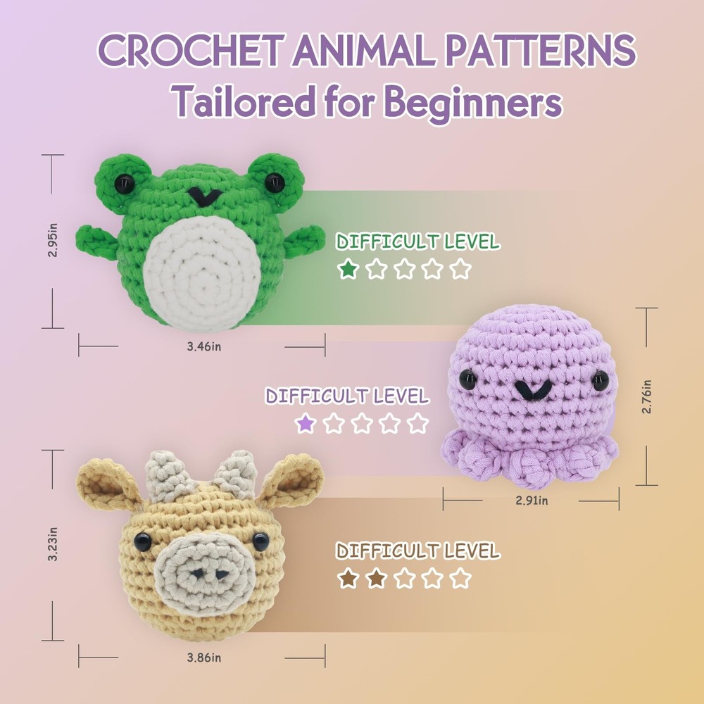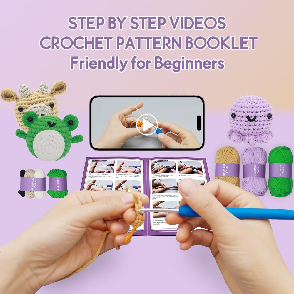 Crochet kits for beginners complete kit: The beginner crochet animal kit comes with easy yarn and easy-to-follow videos. You'll also receive all the tools you need to crochet amigurumi, including a hook, scissors, stuffing, needles, safety eyes, marker clasps, detailed instructions, and pre-started yarn. This kit is ideal for complete beginners. COMPLETE KIT: The beginner crochet animal kit comes with easy yarn and easy-to-follow videos. You'll also receive all the tools you need to crochet amigurumi, including a hook, scissors, stuffing, needles, safety eyes, marker clasps, detailed instructions, and pre-started yarn. This kit is ideal for complete beginners. EASY-TO-FOLLOW VIDEO TUTORIALS: The step-by-step videos will guide beginners from start to finish. They have speed controls to suit your pace๏ผŒ can be watched repeatedly . Thanks to the easy, detailed, and immersive explanations provided for each stage of the learning process, it's easy to follow for beginners. also offers unlimited help via email and text. PREMIUM PRE-START YARN: We've pre-crocheted the first round of the magic ring for you, allowing you to dive right into the second round and beyond. It is very soft and easy for beginners to use, and it will not fray during the weaving process. We've gone the extra mile by providing an additional 40% of yarn in every color, so there is no need to worry about running out of yarn. Enjoy Your New Hobby: Would you like to learn how to crochet? It's very easy to start by watching our basic techniques videos: magic ring, chain stitch, increase, decrease, sewing, and stuffing. The plush animals may appear intricate, but they are actually easy and enjoyable for beginners to make. You'll experience a sense of peace and a feeling of accomplishment when you crochet these animals. GREAT GIFT CROCHET SET: Our crochet kits for beginners make the perfect present for anyone who loves to crochet. This beginner crochet kit can be used as a keychain or a cute decoration, and it is suitable for beginner adults and kids of all ages. It's also a great gift for birthdays, Thanksgiving Day, Christmas, or any special occasions. UNLIMITED HELP AND SUPPORT:If you have any questions or encounter any problems while crocheting our crochet blanket kit for beginners, don't hesitate to contact us. With our guidance and your independent learning, even beginners can successfully complete