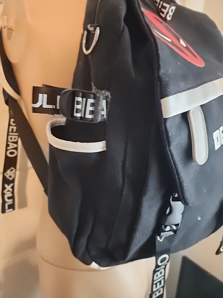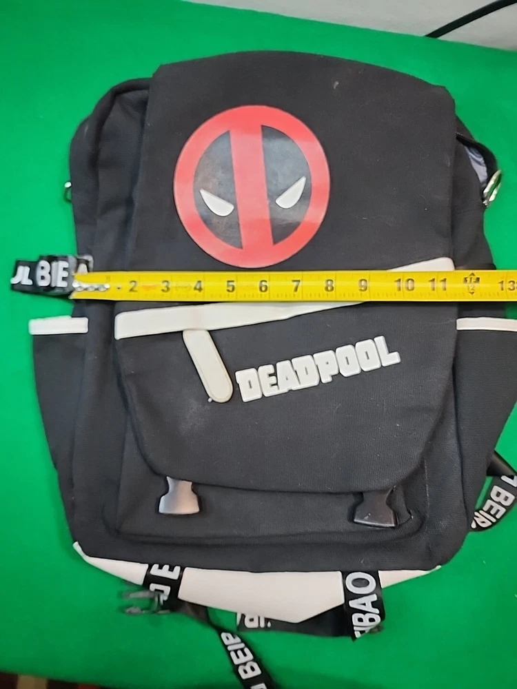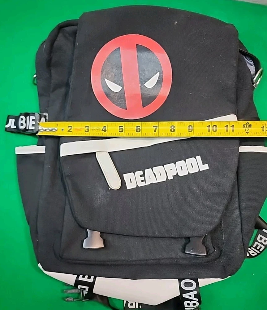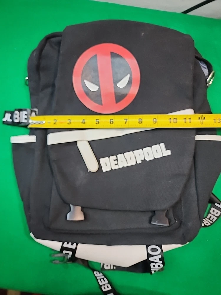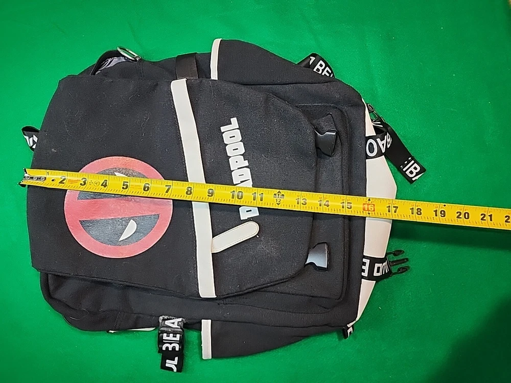 This Beibao Black Deadpool Backpack is a must-have for any fan of the iconic anti-hero. The backpack is made of durable canvas material and features a variety of accents, including an applique of Deadpool's face on the front. It has a medium size of 12 inches in width and 19 inches in height, making it perfect for travel and everyday use. The backpack has several features, including adjustable straps, a buckle and zip closure, inner dividers, a bottle pocket, and an audio pocket. The interior is lined in black and the backpack is designed for unisex adults. It is a limited edition item and is perfect for anyone looking to show off their love for Deadpool. Overall condition is very very good, Bought for my son, he used it one time. Thanks for looking