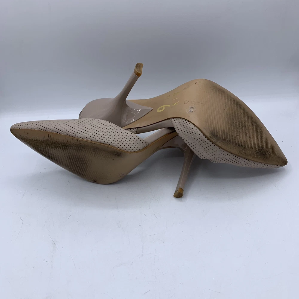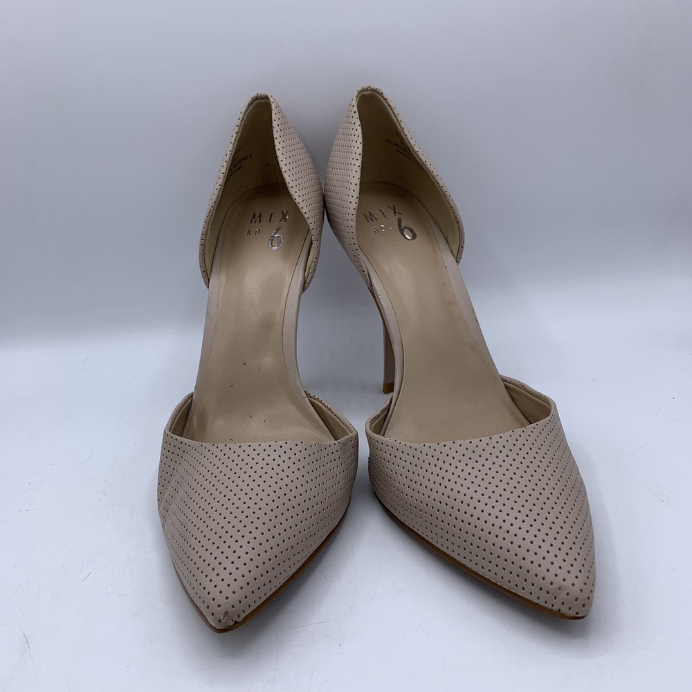 Elevate your fashion game with these stunning Mix No. 6 beige nude high heels. These stilettos have a pointed toe and a sleek patent leather upper that exudes elegance. The comfortable heel height of 3-3.9 inches and under 1-inch platform height make them perfect for any formal occasion, be it a wedding or a cocktail party. The Mix No. 6 heels come in size 9.5 for US and UK, and size 9.5 for AU. The outsole material is made of faux leather, while the insole and lining materials are synthetic. These pumps are a great addition to any classy wardrobe, and the pointed toe stiletto style will make you stand out in a crowd.