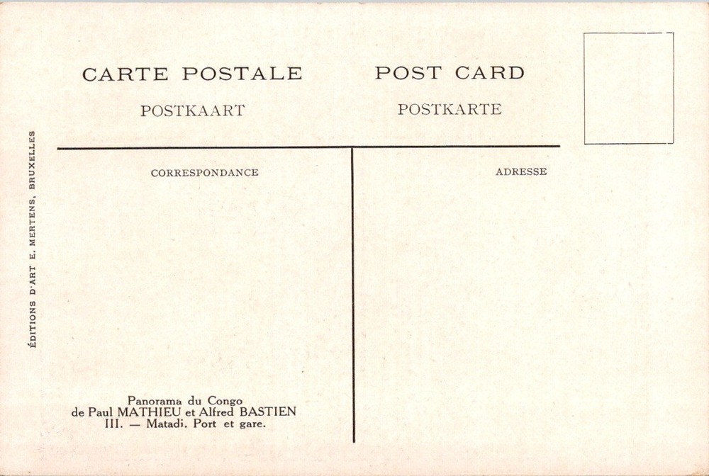An evocative chromolithographic postcard from the celebrated Panorama du Congo series, showing the Port of Matadi and railway terminal. Illustrated by Belgian artists Paul Mathieu and Alfred Bastien, this striking colonial-era image features steamships, rail activity, and Congo River scenery—an excellent addition for collectors of Belgian Congo or African colonial history.