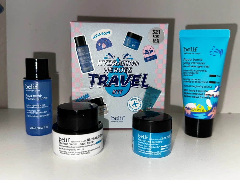 Four-piece Travel Kit of new and cult-favorite belif heroes to increase the skin's hydration levels for a natural glow. Featuring a full-size Aqua bomb jelly cleanser and three deluxe-sized minis. For normal, combination, and oily skin types. This set includes a full routine that delivers an explosion of weightless hydration to dull, depleted skin for a radiant-looking glow. Four-Piece Set Includes: Aqua Bomb Jelly Cleanser: A jelly-textured cleanser that gently washes away makeup and impurities for a cleaner, smoother-looking complexion. Glycerin-based, gentle cleansing agents also help hydrate and clean the skin without stripping moisture. Aqua Bomb Hydrating Toner: A lightweight toner that provides an instant splash of hydration to help nurture skin for a healthy-looking glow. Moisturizing Eye Bomb: A silky, lightweight daily eye cream that floods fine lines and wrinkles with 26 hours of moisture for younger-looking eyes. An essential for smoother makeup application! True Cream - Aqua Bomb: Seal the moisture with aqua bomb! A lightweight gel-cream formulated to burst on contact with the skin for an explosion of lightweight hydration. Instantly boost hydration levels by 70% for a smooth, supple appearance (Based on clinical studies). The weightless formula absorbs quickly while giving the skin a smoother glowing appearance, acting as a perfect primer for makeup. Sizes: Aqua Bomb Jelly Cleanser, 1 oz / 30 ml Aqua Bomb Hydrating Toner, 0.67 oz / 20 ml Moisturizing Eye Bomb, 0.17 oz / 5 ml True Cream-Aqua Bomb, 0.33 oz / 10 ml