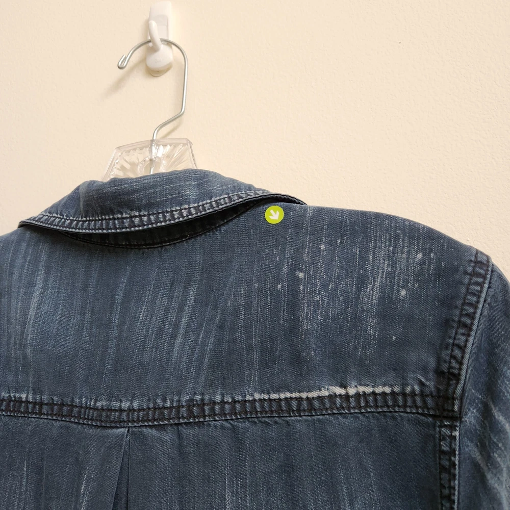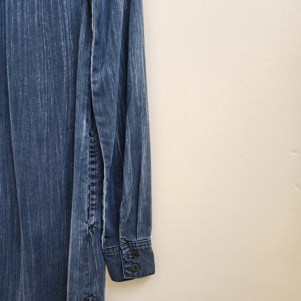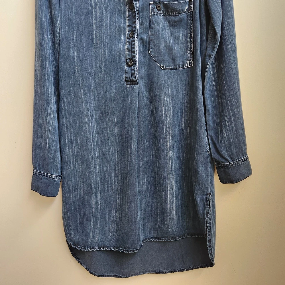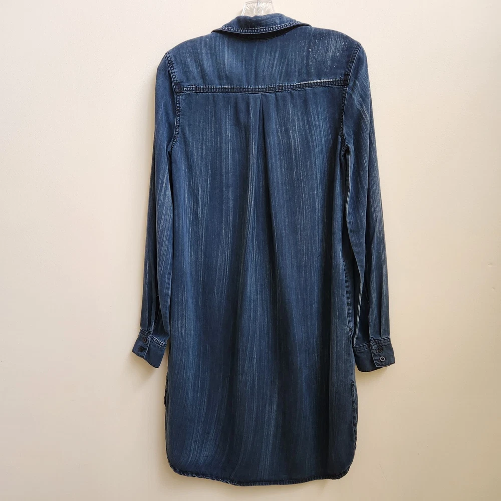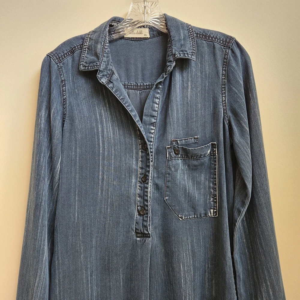 Bella Dahl Navy Acid Wash 1/2 Button Up Dress Size XSmall Pockets Side Slit - Pre-Owned - Has Irregular White Wash Spots on Back Shoulder, See Photo #9 & 10. Otherwise in Very Good Pre-Owned Condition - Measurement –Approximately Shoulder Armpit to Armpit - 13 1/2 in Chest Armpit to Armpit - 17 3/4 in Arms Length - 25 in Length - 38 in - 100% Tencel Lyocell - Spring, Summer, Fall, Night Out, Date Night, Lunch Date, Day Out, Shopping, Casual, Stylish, Chic, Trendy, Festive, and Simple - Returns acceptable within 30 days of purchase unworn, in original condition - Check out my E-bay Store. Lots of Choices Available. Reduced shipping for 2 or more items. Let me know before you pay so I can send you an invoice to discount the shipping
