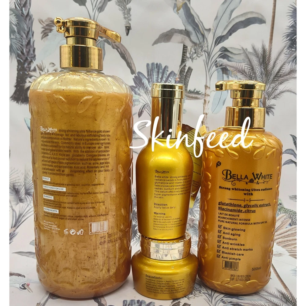 Bella-white Ultra Radiance Whitening Body Lotion, Serum, F.Cream & Shower Gel👌. Another 4in1 skin repair whiting BANGA just landed. Bella white strong whitening ultra radiance is greatly formulated with PURE NATURAL FORMULAR to treat body blemishes like stretch marks, hyperpigmentations, sun burn, wrinkles and more with skin glowing and spf 50. YOUR SKIN WILL THANK YOU LET YOUR SKIN DO THE TALKING