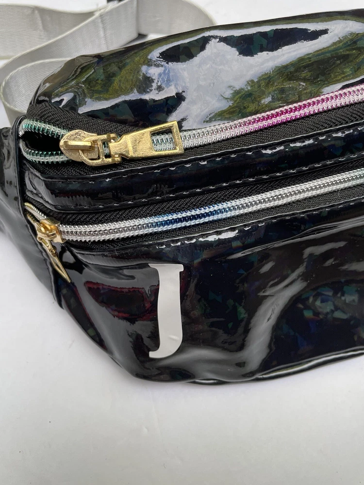 This belt bag is the perfect accessory for any occasion. With a crescent shape and a black exterior color, it is both stylish and functional. The bag has a zip closure and an adjustable strap that fits up to 40 inches, making it a great choice for travel, parties, workwear, and more. The bag has a small size, measuring 11 inches in width, 7 inches in height, and 6 inches in depth, and it features a key holder and a coated finish. The hardware color is multicolor, and the bag has a white lining material and a black canvas handle/strap material. The bag is designed with a sporty theme and the character Initial J, making it a great choice for those who love designer accessories.
