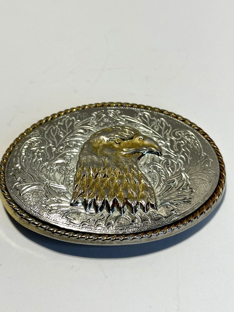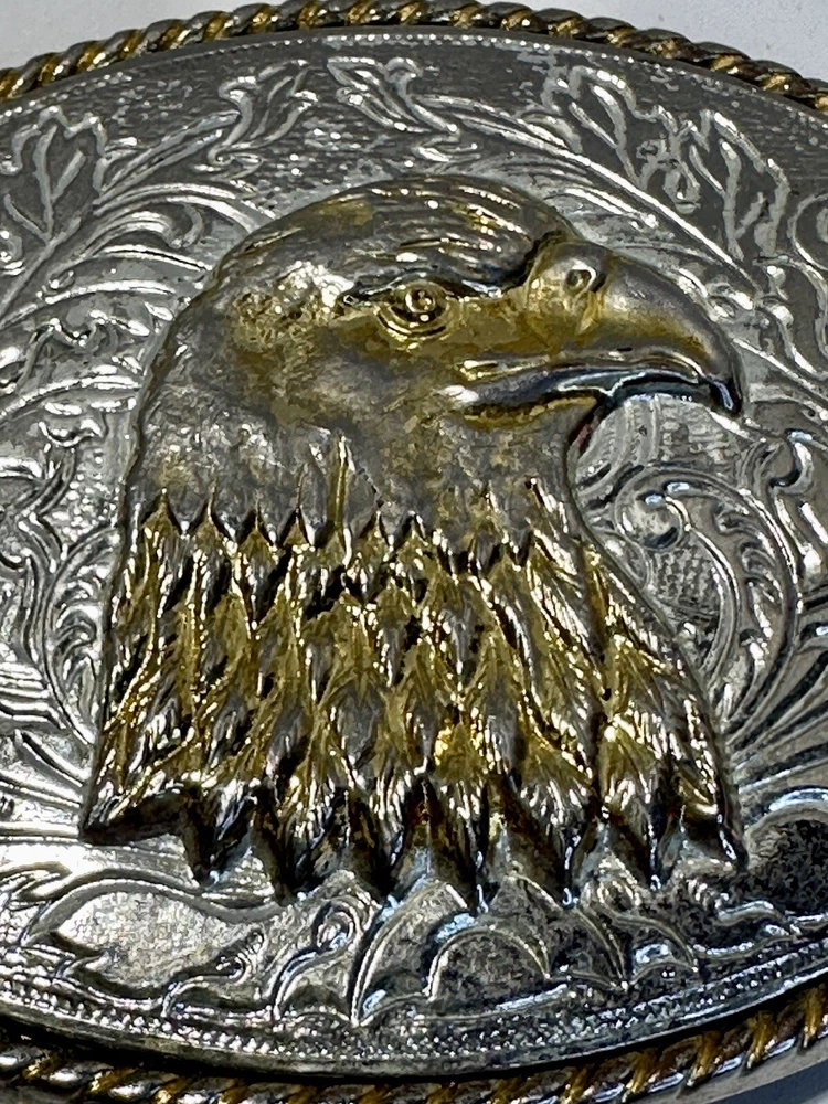 Belt Buckle fits 1 1/2 belt. This is a unique buckle with the American Bald Eagle in two-tone gold and silver. Made in Taiwan by Ivan. Ships quick with care. Thanks for looking. Offers welcome.