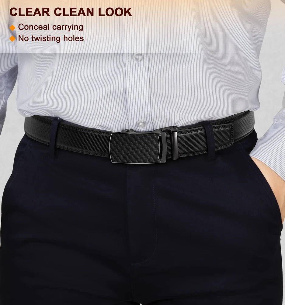 For ratchet belt width 1 3/8; CUT FOR FIT--One Size with waist range 28"-52" by cut for fit,there are size marks in the back of strap for your desired size,easy to cut and never wrong size; MATERIAL--Two layers spilit leather without any mid-refiiling,reiforced flat edge with solid stitching makes it strong. It enable a pulling force up to 60Pounds for daiy use by fat guys; USER FRIENDLY--Feeling soft and friendly in hand,warm but firm delicated coating will always hold your pant on and keep it clean; STYLISH--Multi colors for selection,easy matching for dress,casual or jeans.