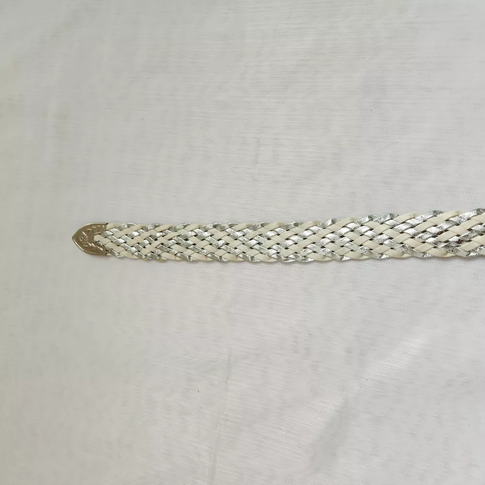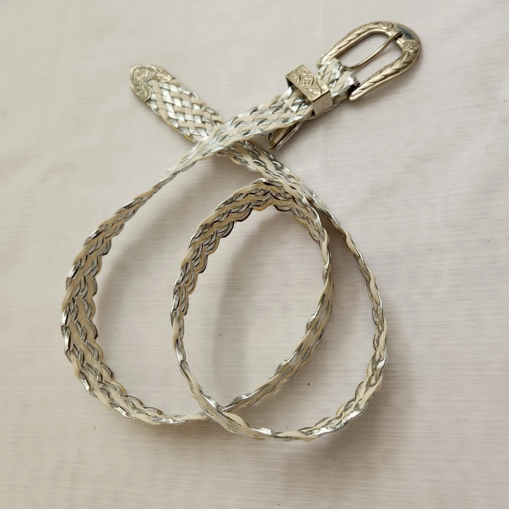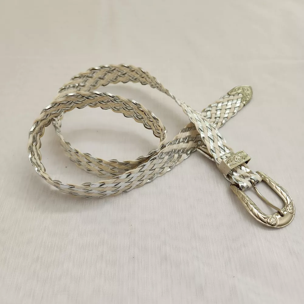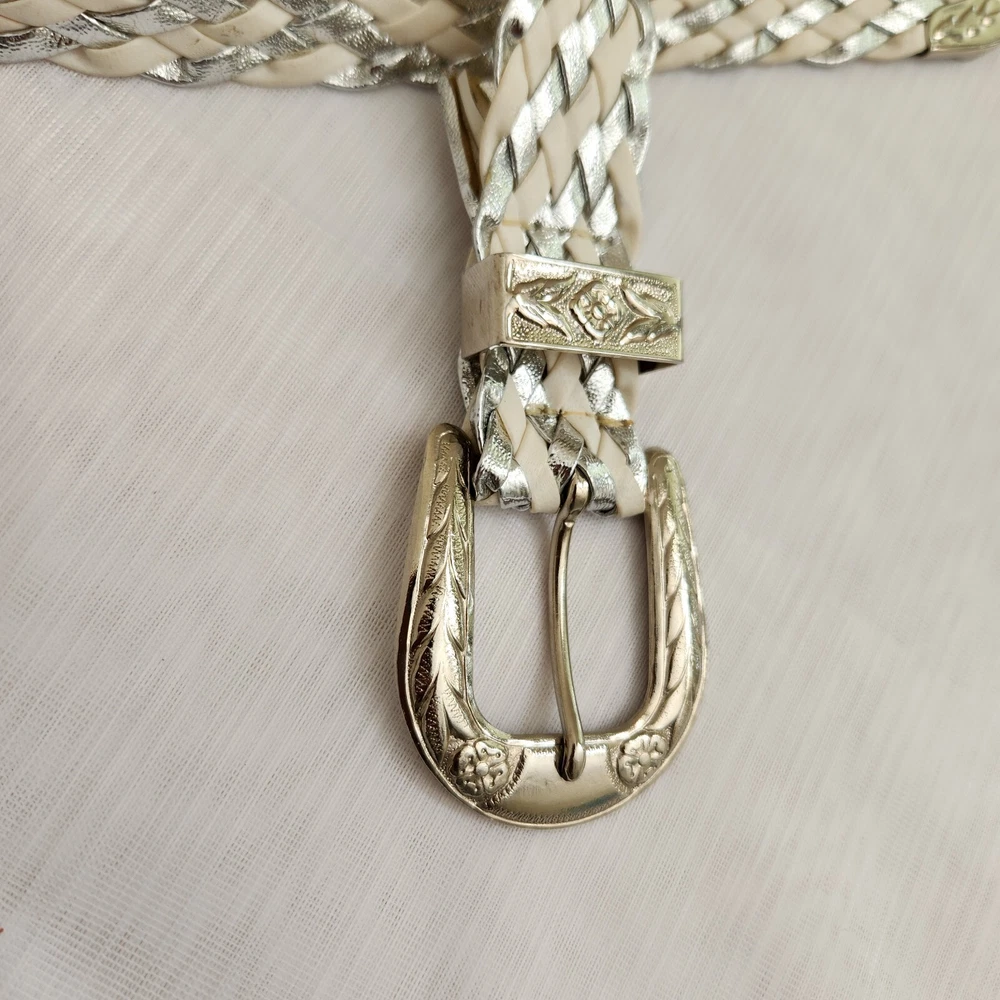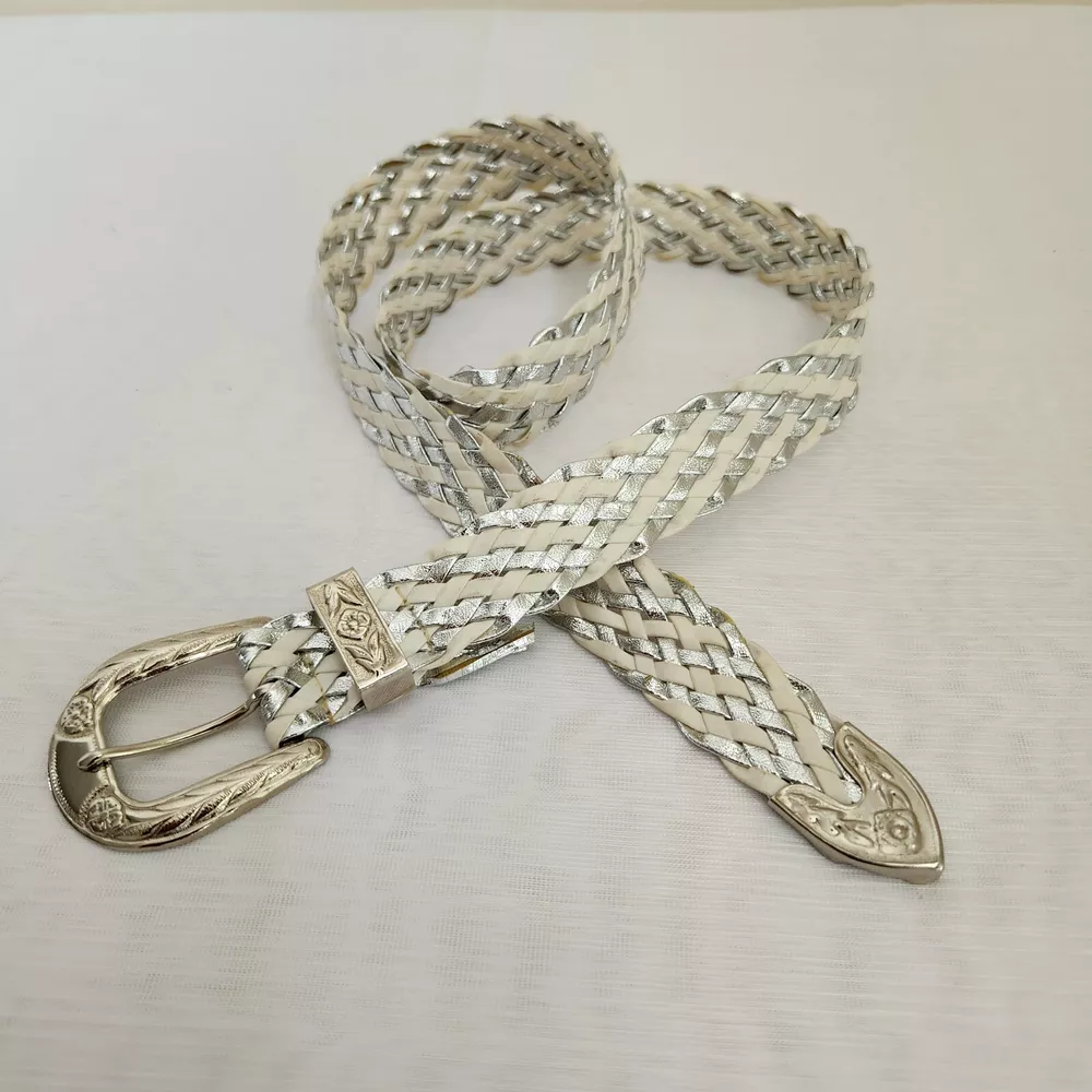 Belt Women 37.5 inches White Silver Metallic Braided Silver Floral Ornate Buckle - Pre-Owned in Very Good Condition - Measurements Length - 37 1/2 in Width - 1 in - Returns acceptable within 30 days of purchase unworn, in original condition - Check out my E-bay Store. Lots of Choices Available. Reduced shipping for 2 or more items. Let me know before you pay so I can send you an invoice to discount the shipping