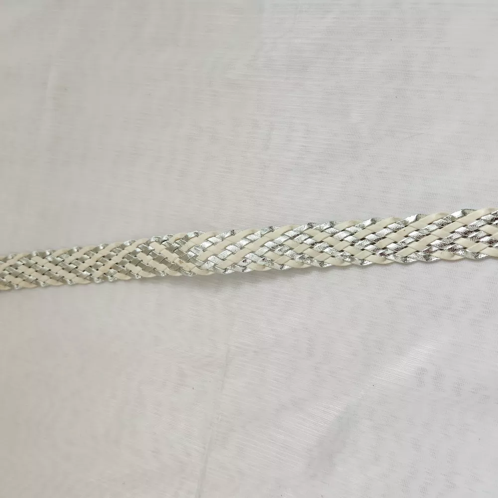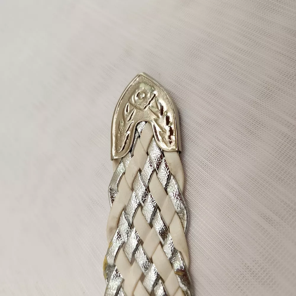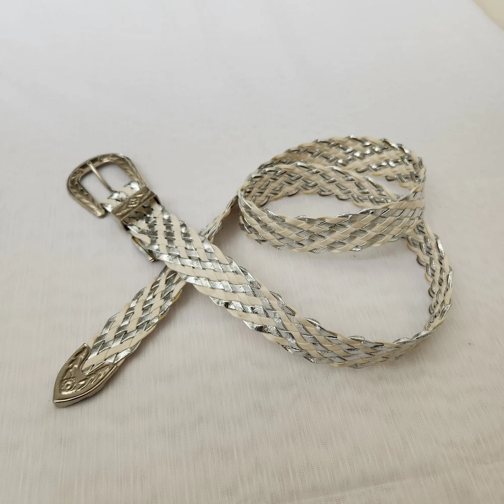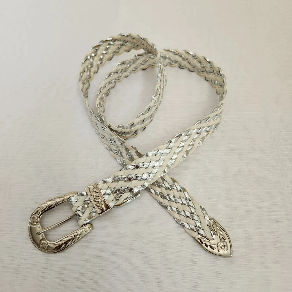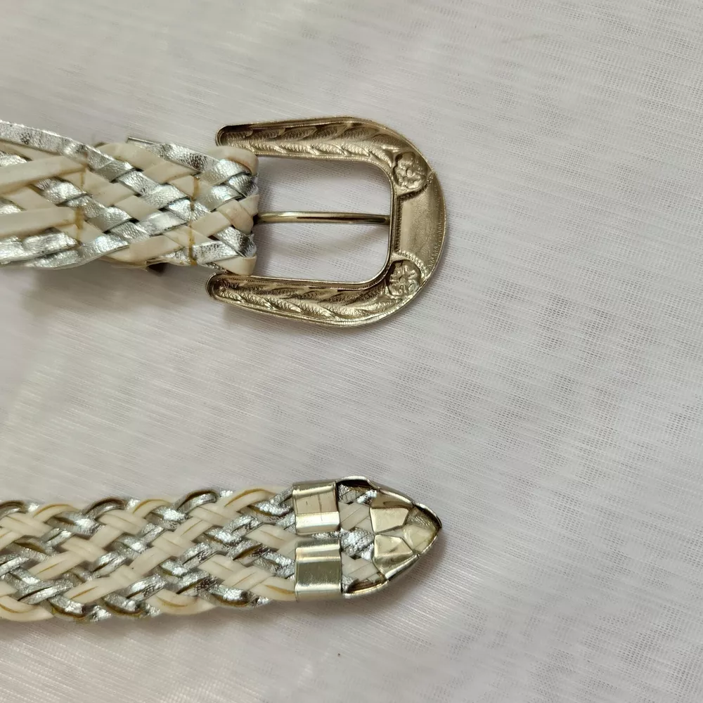 Belt Women 37.5 inches White Silver Metallic Braided Silver Floral Ornate Buckle - Pre-Owned in Very Good Condition - Measurements Length - 37 1/2 in Width - 1 in - Returns acceptable within 30 days of purchase unworn, in original condition - Check out my E-bay Store. Lots of Choices Available. Reduced shipping for 2 or more items. Let me know before you pay so I can send you an invoice to discount the shipping