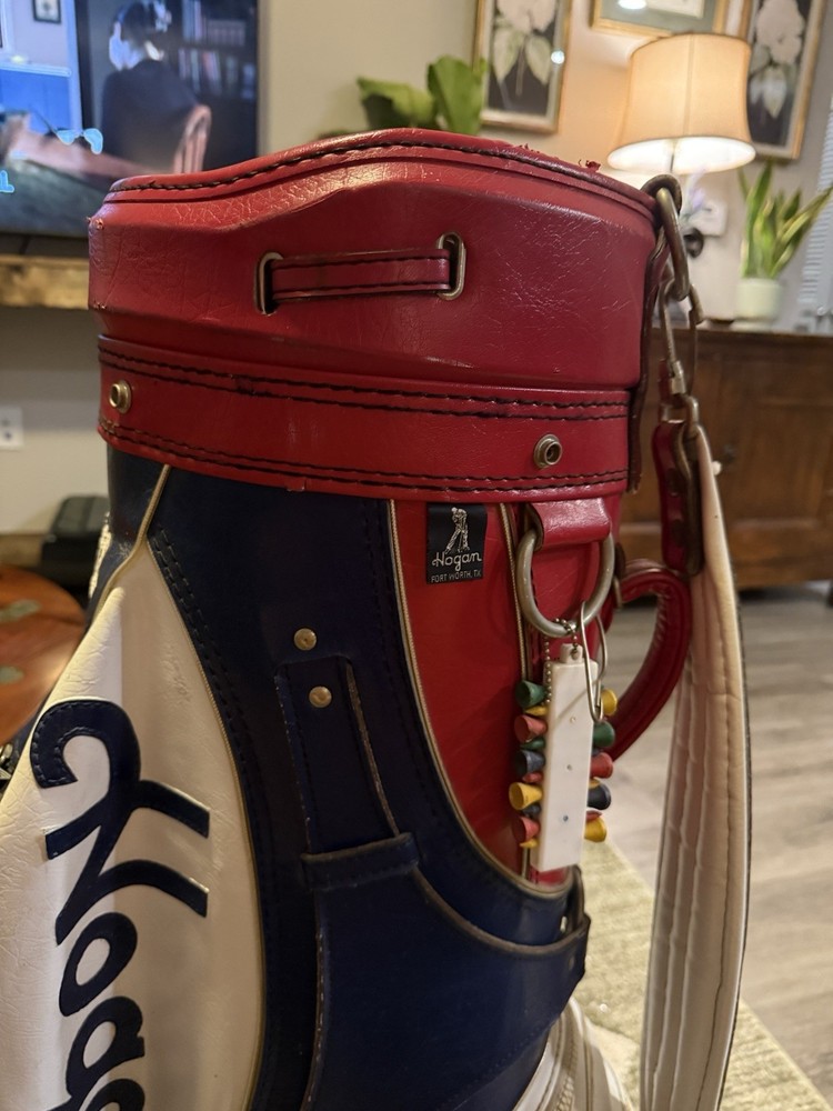 The Ben Hogan Vintage Leather Golf Club Bag in Red, White, and Blue is a stylish and functional carry bag perfect for any golfer. Made of high-quality leather, this large bag features a 3-way divider system, multiple pockets, including an umbrella holder and a water-resistant rain cover. The zip closure, padded shoulder strap, and carry handle make it convenient for transportation on the golf course. The patriotic color scheme and vintage design make this bag a timeless choice for any golfer looking to add some style to their game.