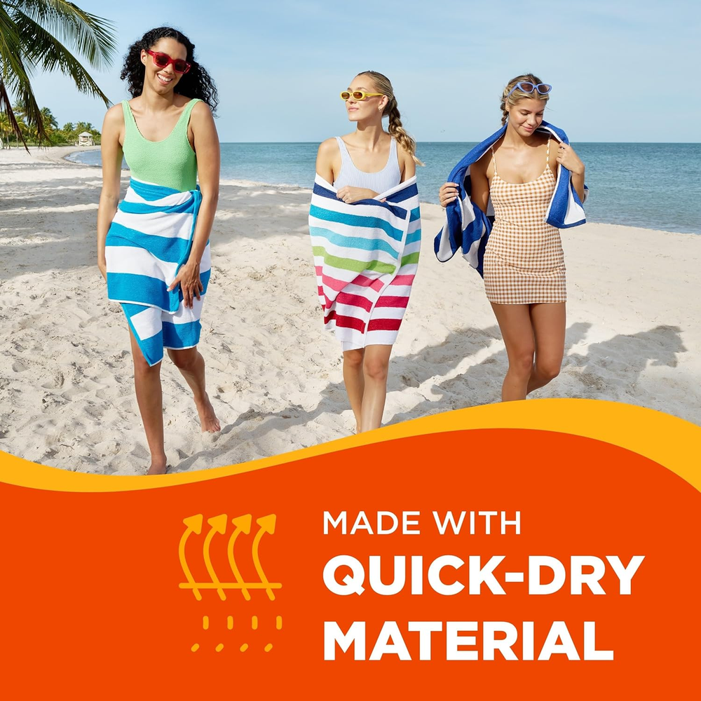 This beach towel is a total game-changer! Super soft, super absorbent, and the perfect size for lounging by the pool or beach. The stripes give it a fun, stylish look, and the cotton terry feels amazing against the skin. It dries fast and holds up great after multiple washes—no fading or fraying. The 6-pack is such a steal, perfect for family trips or gifting. Lightweight yet durable, it’s a must-have for summer adventures. Highly recommend!