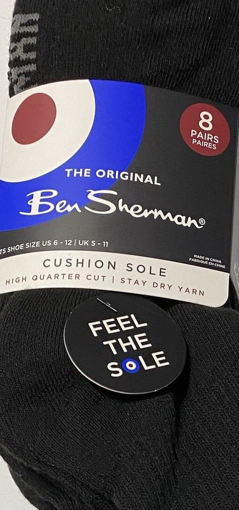 The Original Ben Sherman Men's Cushioned 8 -Pair High Quarter Cut Socks 97% Polyester 3% Spandex Black Sock Size 10-13 fits U.S. Shoe Size 6-12