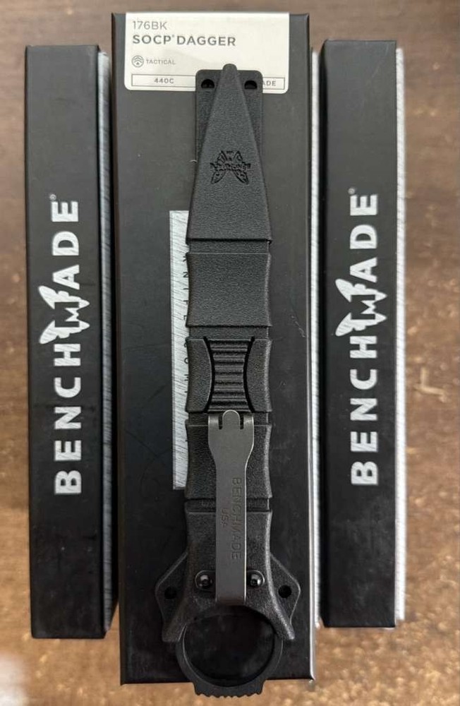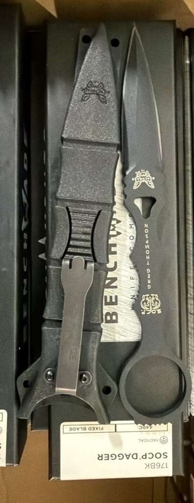 Benchmade 176BK SOCP Dagger Black Sheath Fixed Blade Knife with free shipping The Benchmade 176BK SOCP Dagger Fixed Blade Knife is a tactical-grade, high-performance knife designed for precision, durability, and dependable use in demanding situations. Featuring a high-quality stainless steel dagger blade with a black-coated finish, this knife delivers superior edge retention, corrosion resistance, and a razor-sharp point for piercing and tactical applications. Its symmetrical double-edged design makes it ideal for controlled thrusting and precise cutting.Built for strength and reliability, the 176BK SOCP has a full tang construction that ensures maximum durability under heavy use. The ergonomic handle provides a secure and comfortable grip, even during extended wear, and is designed to give the user complete control over the blade. The knife comes with a custom black sheath that allows for convenient carry and quick access, whether worn on a belt or tactical gear.This fixed-blade knife is crafted with Benchmade’s signature attention to detail and high-quality materials, making it a trusted choice for military, law enforcement, collectors, and outdoor enthusiasts who require a robust and dependable tactical knife. With free shipping included , the Benchmade 176BK SOCP Dagger is ready for immediate use straight out of the box, combining functionality, durability, and sleek tactical styling in one compact package. Key Features Model: Benchmade 176BK SOCP Dagger Blade type: Fixed blade, double-edged dagger Blade material: High-quality stainless steel with black-coated finish Blade design: Symmetrical double-edged for precise piercing and cutting Full tang construction for maximum strength and durability Ergonomic handle for secure and comfortable grip Includes black sheath for safe carry and quick access Ideal for tactical, military, law enforcement, and outdoor use Precision Benchmade craftsmanship and quality materials Compact, lightweight design for portability and ease of use Free shipping included Item Contains Benchmade 176BK SOCP Dagger fixed blade knife Original Benchmade protective black sheath Factory protective packaging Manufacturer paperwork Warranty information card Care and maintenance instructions Original product box About This Item The Benchmade 176BK SOCP Dagger Fixed Blade Knife is a high-performance tactical knife designed for reliability, precision, and durability in demanding situations. It features a sharp, double-edged stainless steel blade with a black-coated finish, providing excellent edge retention, corrosion resistance, and effective piercing capability. The full tang construction ensures maximum strength, while the ergonomic handle delivers a secure and comfortable grip for controlled handling. This knife comes with a custom black sheath for safe, convenient carry and quick access, making it ideal for tactical, military, law enforcement, or outdoor use. Crafted with Benchmade’s renowned attention to detail and superior materials, the 176BK SOCP Dagger combines functionality, durability, and sleek tactical design. With free shipping included , it’s ready to use straight out of the box.