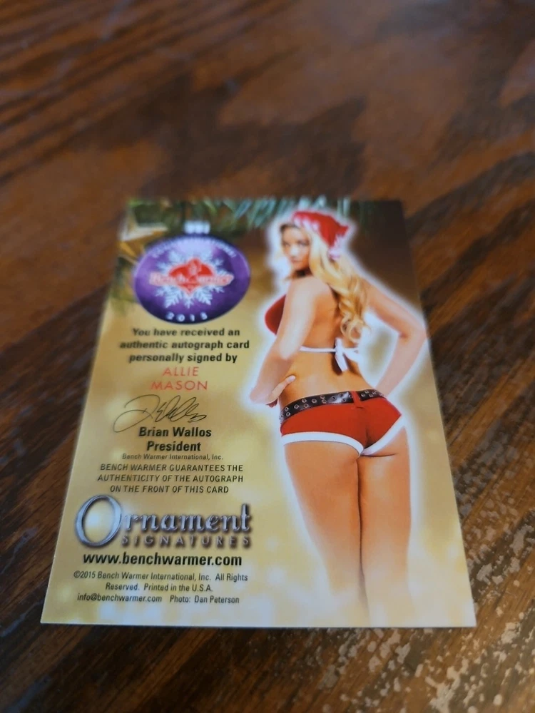 Benchwarmer 2015 Allie Mason Happy Holidays Ornament Signatures Autograph Card Allie Mason is known for Hero of the Lane (2013) , Interview with a Gingerbread Man (2009) and 8th Annual Babes in Toyland: Live from Avalon Hollywood (2015) . She has posed in Playboy, Glam Jam and FHM. Please, look at all the pictures. Please check out my other eBay accounts... https://www.ebay.com/usr/kimmyrael https://www.ebay.com/usr/matlac99 https://www.ebay.com/usr/lacr6837 https://www.ebay.com/usr/malac9440 https://www.ebay.com/usr/lacr_3567 https://www.ebay.com/usr/lacroki8 https://www.ebay.com/usr/lacroki9 Shipping only to the continental US unless you contact me first. Will combine shipping!!!