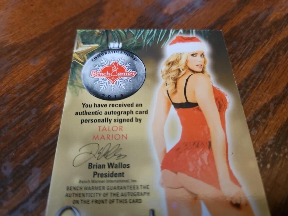 Set: Benchwarmer 2015 Holiday Year Manufactured: 2015 Subject Type: Glamour Language: English Autographed: Yes Card Size: Standard Featured Cards: Talor Marion Features: Autograph Material: Card Stock Franchise: Benchwarmer Card Name: Talor Marion Type: Non-Sport Trading Card Signed By: Talor Marion Genre: Models & Playmates Original/Licensed Reprint: Original Country/Region of Manufacture: United States Autograph Format: Hard Signed Featured Person/Artist: Talor Marion Manufacturer: Benchwarmer Parallel/Variety: Gold