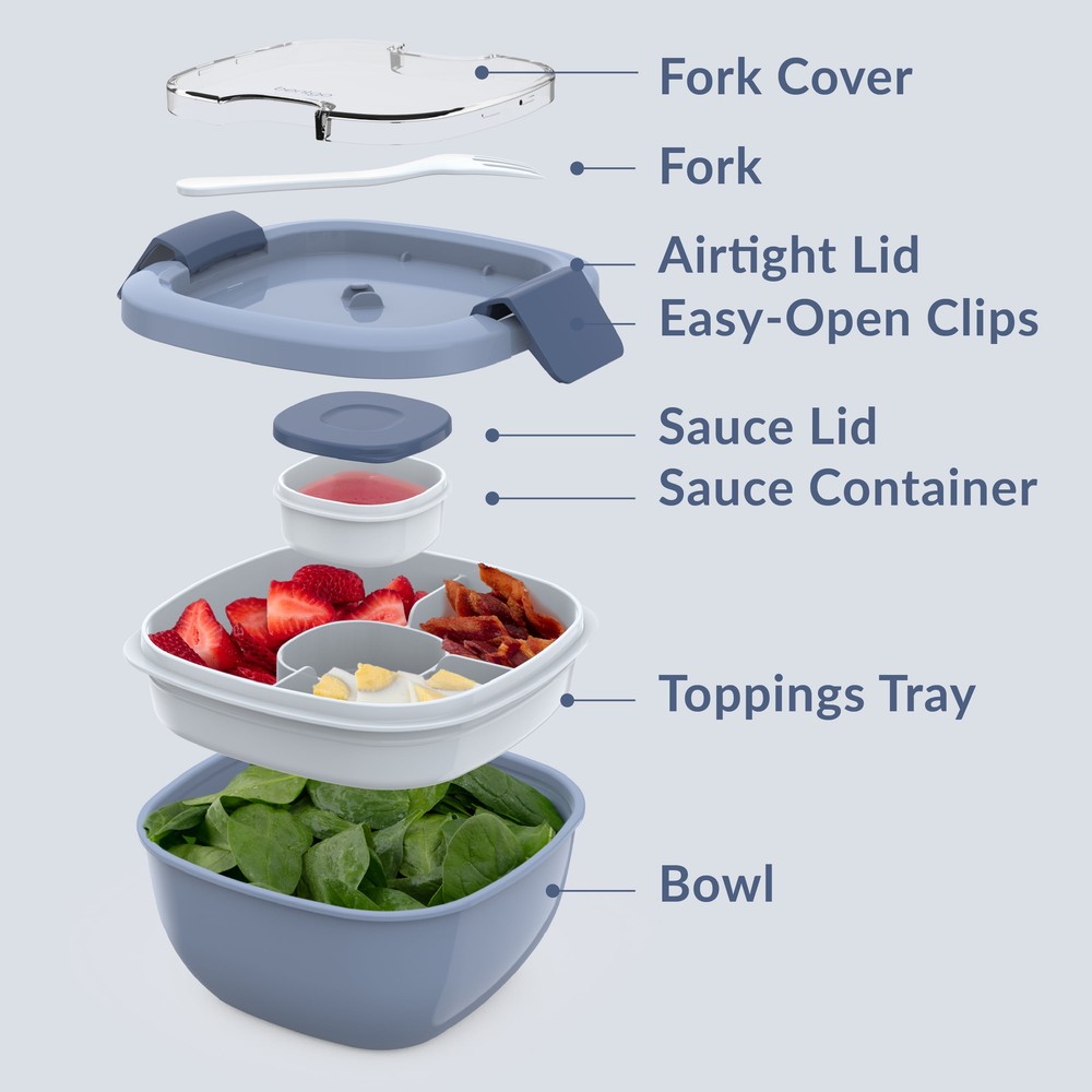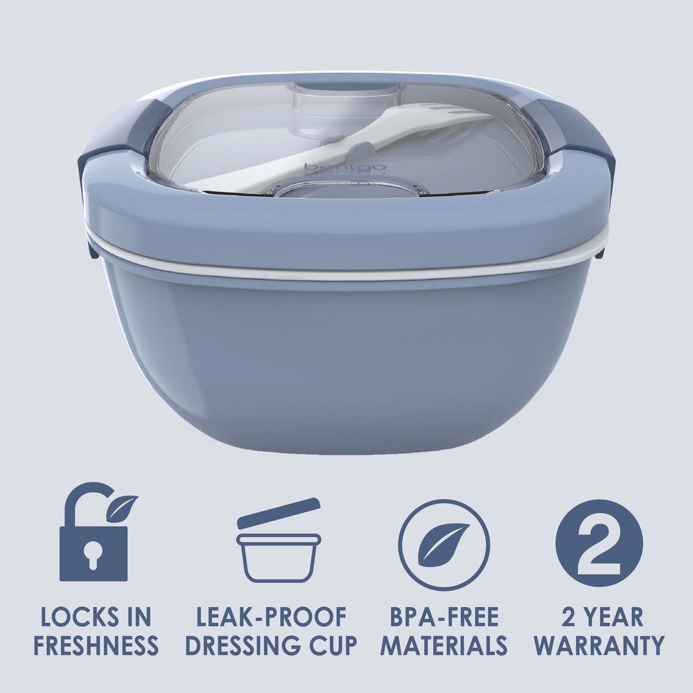 Bentgo® Salad makes eating fresh and healthy salads on-the-go easier than ever. The all-in-one portable design offers the perfect solution for mess-free transport of your lettuce, toppings, and dressing, so you can enjoy a delicious and nutritious salad at work, at the park, on a plane, or just about anywhere! This stackable and packable style nests a spacious salad bowl with a 4-compartment toppings tray on top, along with a leak-proof sauce container to separate your dressings. It’s all secured with an airtight sealing lid and locking clips, so everything stays fresh and mess-free every time you enjoy your salads!