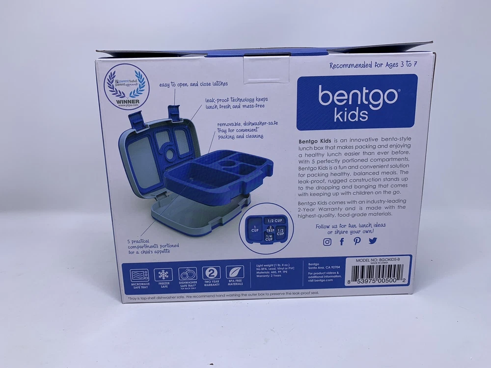 This Bentgo Kids lunch box is the perfect solution for parents looking for a reliable and stylish way to pack their child's lunch. The box is made of BPA-free plastic and features a snap lid to keep food fresh and secure. With five compartments, the lunch box can hold up to 16 oz of food, and the rectangular shape with a solid blue pattern is both modern and eye-catching. The lunch box is dishwasher safe, making it easy to clean, and it comes with an insert for added convenience. The item diameter is 2 inches, and it has a width of 8.5 inches by 6.5 inches. This lunch box is perfect for kids who want to enjoy a healthy meal at school without the worry of food spilling or leaking.