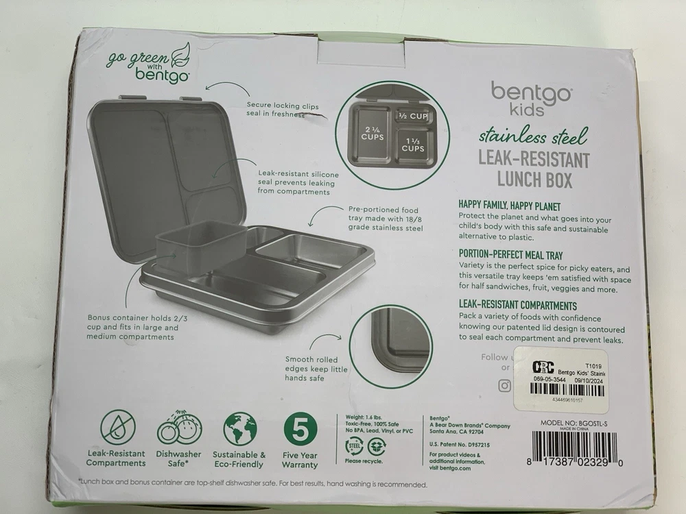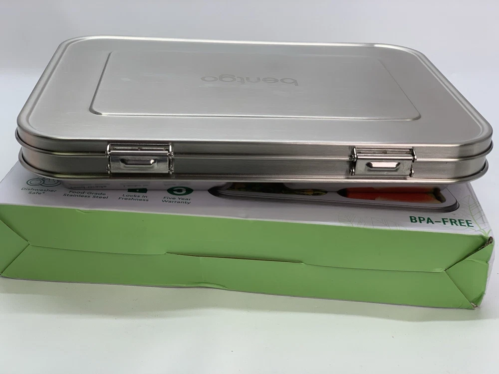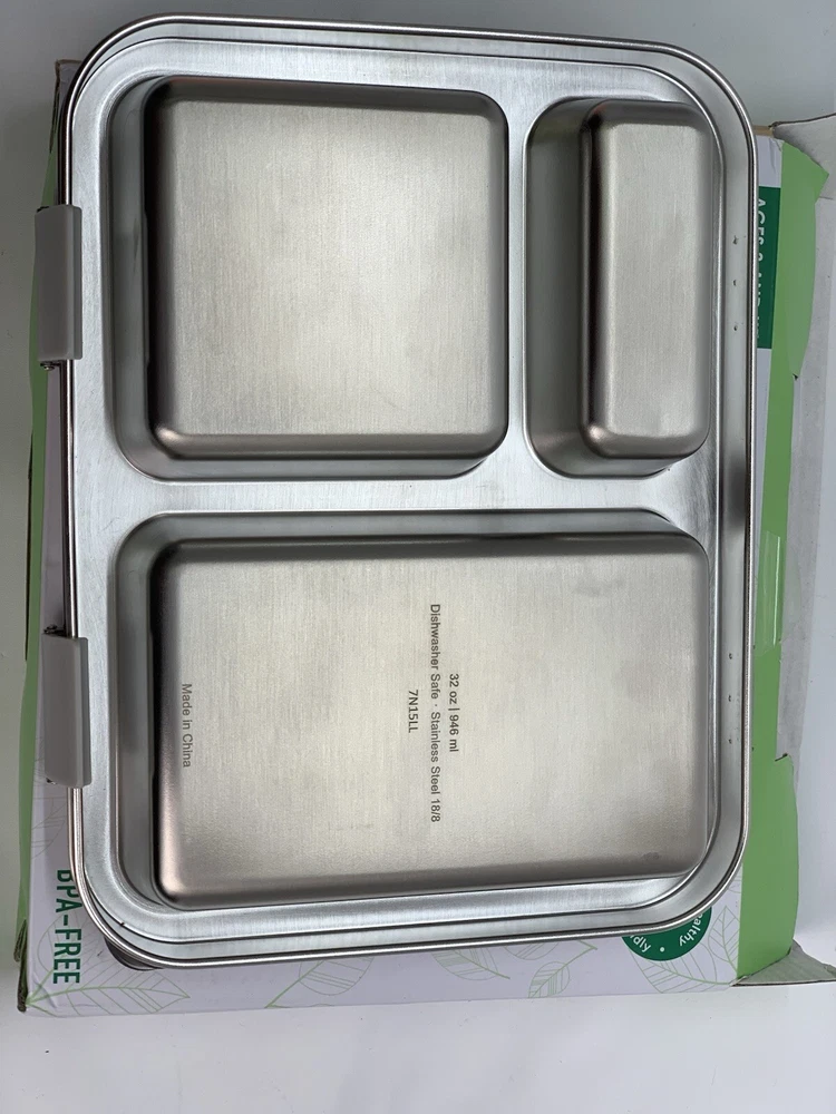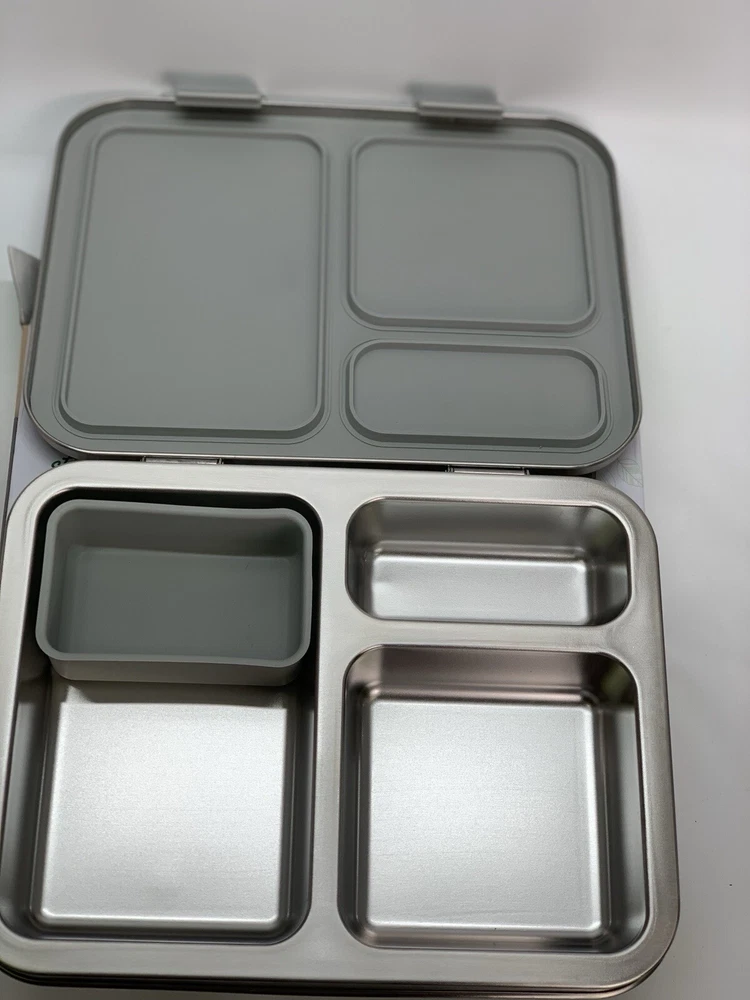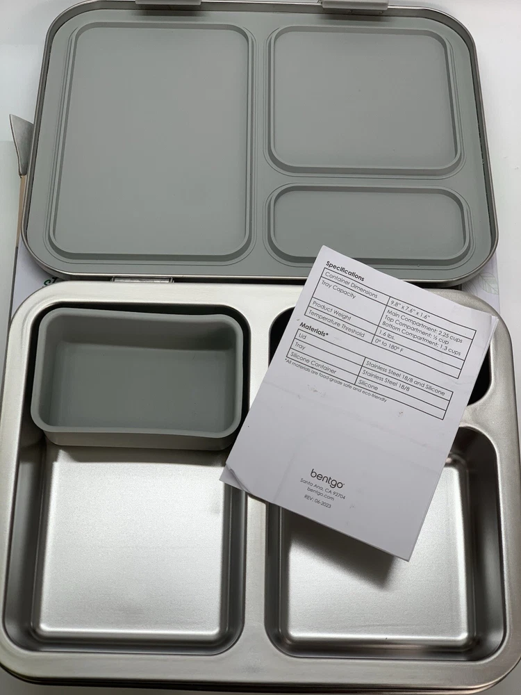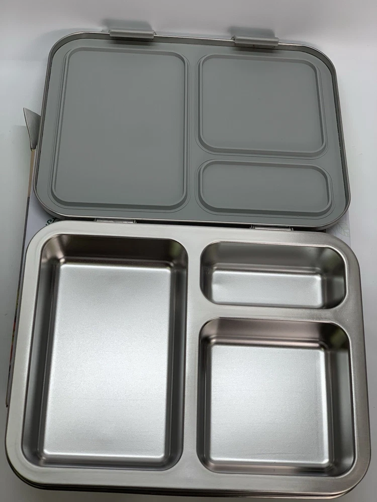 Capacity: 4+ Cups Shape: Rectangular Personalize: No Brand: Bentgo Type: Lunch Boxes and Bags Material: 18/8 Stainless Steel Item Height: 8.25 in. MPN: BGOSTL-S, 7N15LL Set Includes: Divided Tray Color: Silver Item Depth: 1.75 in Number of Compartments: 3 Lid Type: Latches Item Width: 10 in UPC: 817387023290 gtin13: 817387023290 Features: BPA Free