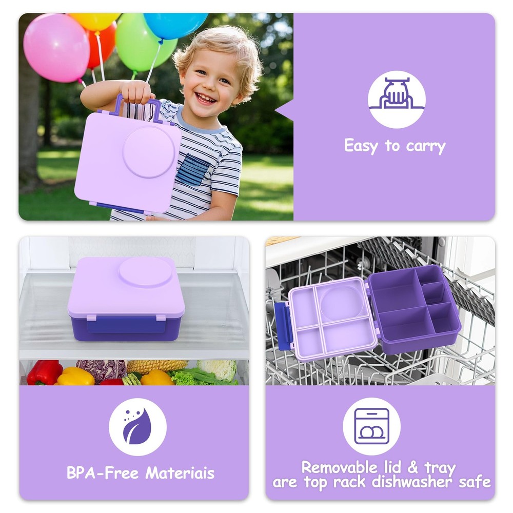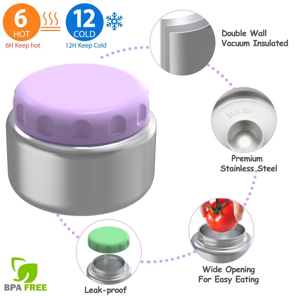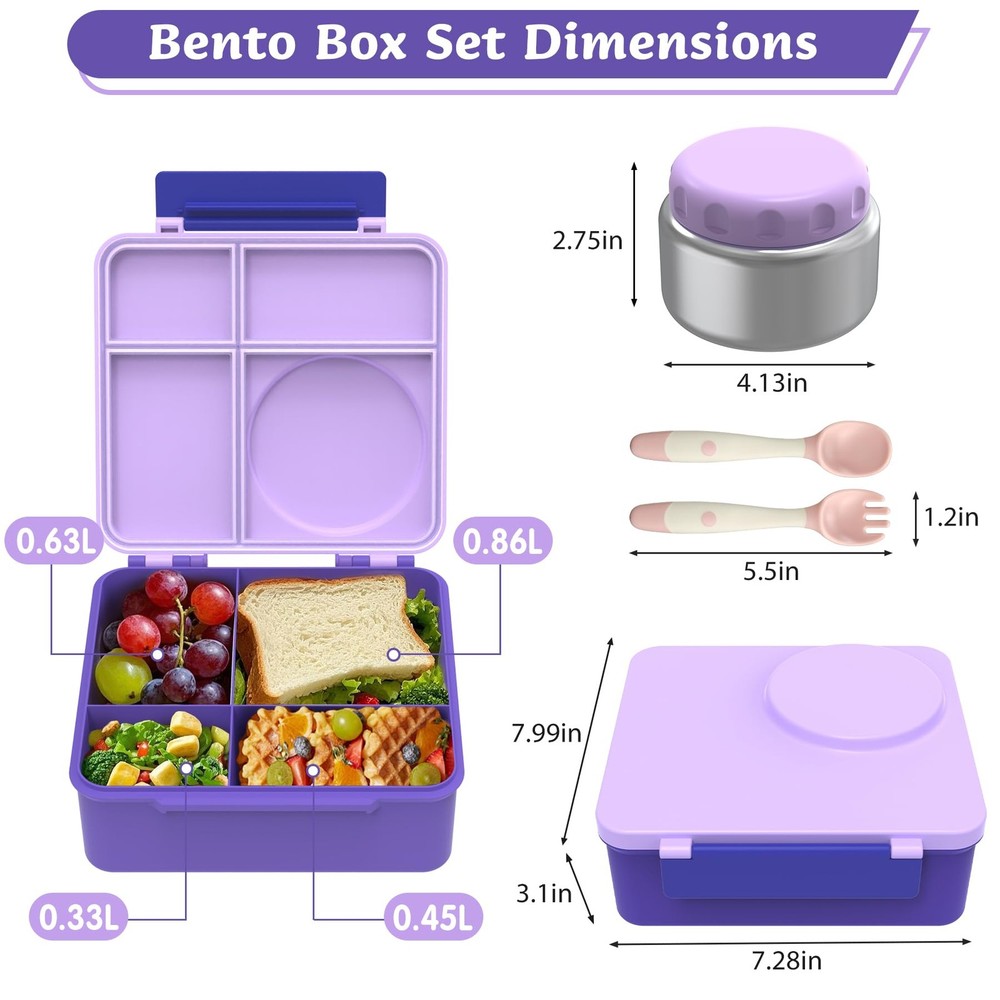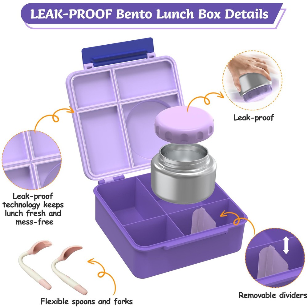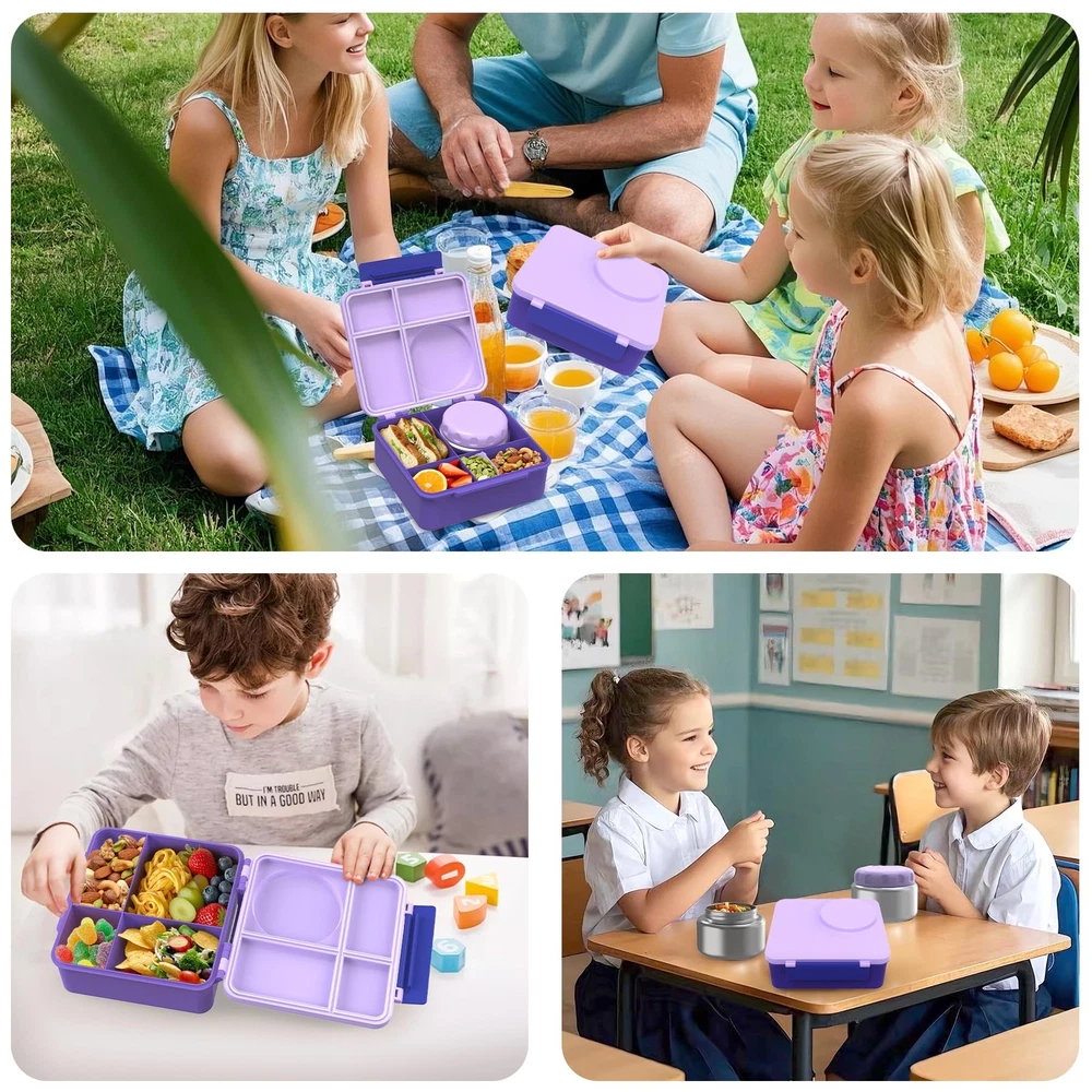 Make lunchtime exciting and organized with this comprehensive lunch box set designed specifically for kids. The versatile bento-style container features 4 separate compartments, perfect for portion control and keeping different foods from mixing. The included 8oz thermos food jar maintains food temperature, making it ideal for soups, pasta, or other hot meals. The leak-proof design helps prevent messy spills in backpacks or lunch bags. Complete with an insulated lunch bag, this set provides everything needed for a well-organized school lunch. The practical compartment layout allows parents to pack a balanced meal with main courses, sides, and snacks while keeping everything fresh and separate. The durable construction stands up to daily use, making this set a reliable choice for busy school days. Perfect for elementary school children who enjoy variety in their lunches. HIGH QUALITY:Crafted with premium, food-safe materials, this BPA-free bento box features a durable 304 stainless steel insulated container for long-lasting use. COMPLETE SET: Includes 4-compartment bento box container, foldable fork spoon, and 8-ounce capacity thermal insulated food jar for hot meals THERMAL PERFORMANCE: Food jar maintains temperature of hot foods, perfect for soups, pasta, and other warm lunch items COMPARTMENT DESIGN: Four separate sections in the lunch container help organize different food items and prevent mixing LEAK-PROOF CONSTRUCTION: Secure sealing technology prevents spills and keeps food fresh during transport PRACTICAL SIZE: Compact lunch set fits easily in backpacks while providing ample space for a complete meal EASY TO CLEAN: The bento box is dishwasher-safe. Key parts like sealing rings and the insulated jar are detachable, and the wide-mouth container simplifies cleaning.