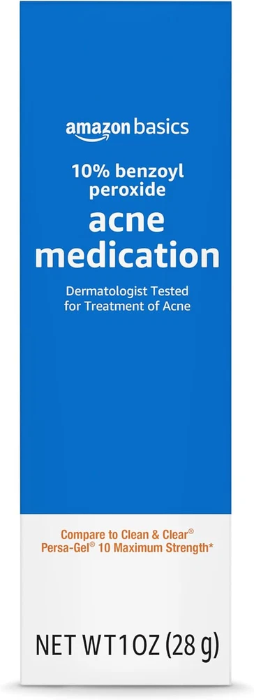 Benzoyl Peroxide Acne Medication 10%, Maximum Strength, 1 Fl Oz Face Gel One 1-fluid ounce tube of benzoyl peroxide acne medication for the treatment of acne Dermatologist tested for Treatment of Acne Compare to Clean and Clear Persa-Gel 10 maximum strength Active ingredient: 10% Benzoyl Peroxide acne medication An Amazon Brand 1.51 inches x 0.99 inches x 4.24 inches. Weight: 1.45 oz Scent Unscented Product Dimensions 0.99 x 1.51 x 4.24 inches; 1.45 ounces Country of Origin USA Product Benefits Anti-Acne Skin Type Sensitive Item Form Gel