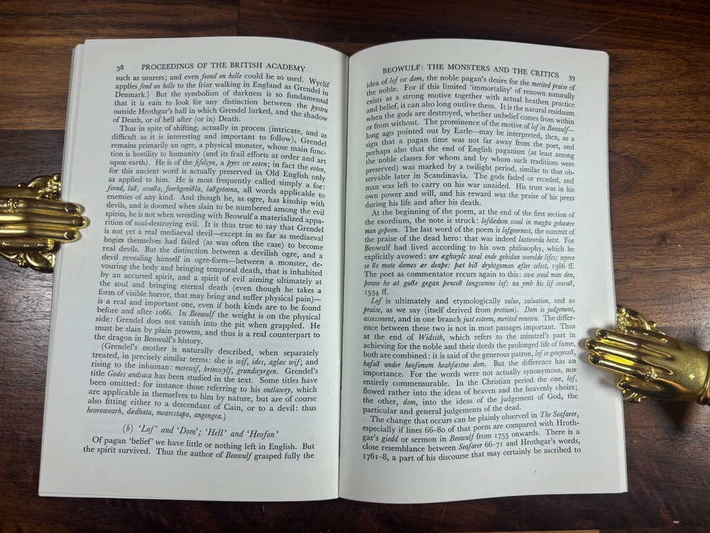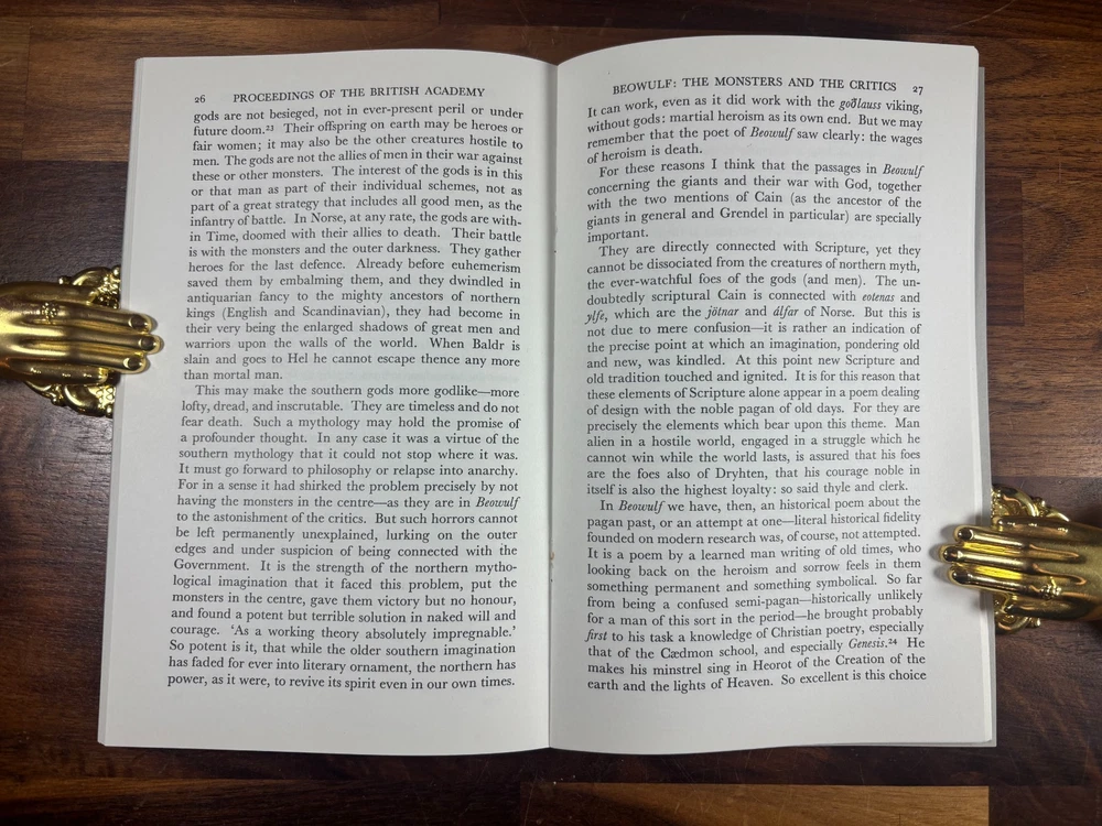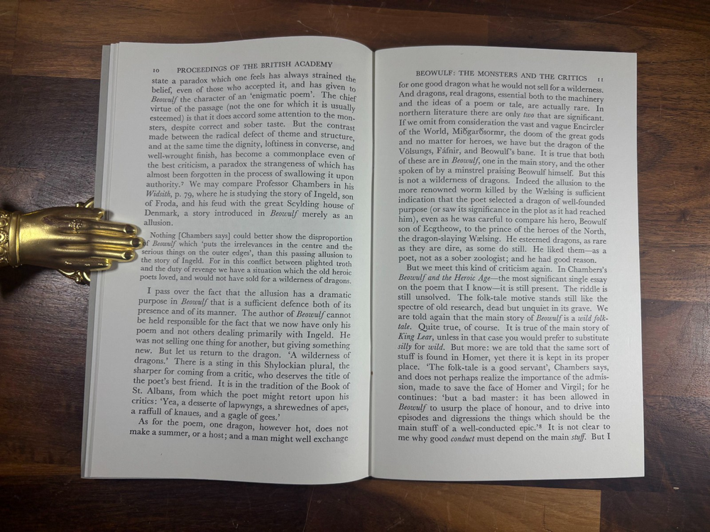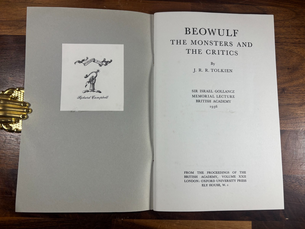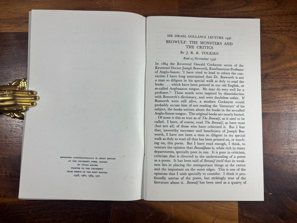 Beowulf: The Monsters and the Critics J. R. R. Tolkien OUP 1971 Reprint Author: J. R. R. Tolkien Title: Beowulf: The Monsters and the Critics Publisher: Oxford University Press Year: 1971 (lithographic reprint) Format: Softcover pamphlet, original grey card wrappers Pages: 53 Printed at: The University Press, Oxford (Vivian Ridler, Printer to the University) Description Offered here is an original Oxford University Press lithographic reprint (1971) of J. R. R. Tolkien’s seminal lecture Beowulf: The Monsters and the Critics , first delivered in 1936 as the Sir Israel Gollancz Memorial Lecture to the British Academy. This edition was reprinted from the sheets of the first edition , as stated, and retains the original academic pamphlet format. It is not a later essay collection but the standalone publication as issued by OUP. The booklet is complete, clean, and well-preserved, with original grey wrappers intact. Condition Clean grey card wrappers Internally clean: no writing, highlighting, or library markings Staples sound, pages tight One small flaw only : a tiny closed tear at the very bottom of the spine Overall a strong, attractive copy for its age and format Edition Notes OUP lithographic reprint listing reprints of 1958, 1960, 1963, and 1971 Priced “30p net” on the wrapper (confirming the 1971 issue) Printed from first-edition sheets, as issued About J. R. R. Tolkien J. R. R. Tolkien (1892–1973) was Professor of Anglo-Saxon at Oxford and one of the most influential literary scholars of the 20th century. While best known as the author of The Hobbit and The Lord of the Rings , Tolkien was first and foremost a medievalist. Beowulf: The Monsters and the Critics is widely regarded as one of the most important works of literary criticism ever written on Beowulf . In it, Tolkien transformed the academic understanding of the poem by arguing that its monsters are central to its artistic and thematic meaning, rather than marginal folklore elements. This essay reshaped Beowulf studies and remains essential reading for scholars and students alike. Why This Copy Matters Standalone Tolkien scholarly publication Original OUP academic issue, not a modern reprint Increasingly scarce in clean condition Sought after by Tolkien collectors and medieval literature scholars Dimensions: Weight - 100g Height - 21.5cm Width - 13.8cm Thickness - 4mm