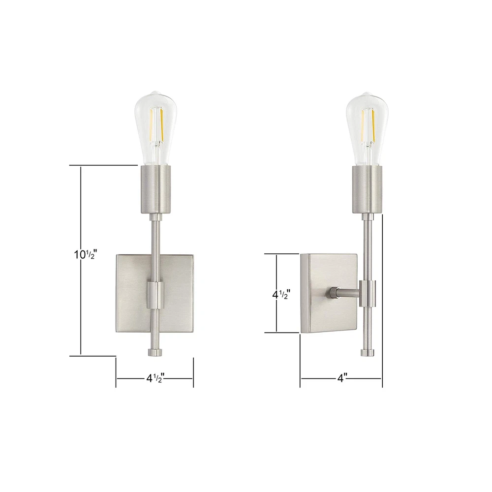 The Berbella single light wall sconce offers an industrial farmhouse design and a clean, contemporary look. The sleek metal finish, combined with dual exposed bulbs results in a stylish wall-mounted light fixture that coordinates beautifully with a wide range of home decor styles, from sleekly modern to farmhouse and beyond. Perfect for bathrooms, corridors, dining rooms, living areas, bedrooms and other spaces. Metal construction, brushed nickel finish Measures 4.5 inches wide by 14.5 inches high; extends 4 inches from the wall Dimmable when used with ELV dimmer Includes 4W 400 lumen, LED filament Edison style bulbs, 2,700K color temperature Works with most bulbs - with smart bulbs or most medium base bulbs up to 60W 1-year manufacturer with US based UL listed LED EDISON BULB INCLUDED - Brushed nickel light wall sconce comes with LED light bulb. Led wall sconce is dimmable and with most standard medium base bulbs EASY INSTALLATION - Farmhouse wall sconce vanity light with 4.5" mounting plate for simple hardwired installation. Can be installed uplight or downlight as bathroom sconces beside mirror MODERN WALL SCONCE LIGHT - Brushed Nickel sconce wall lighting is perfect for modern contemporary and traditional design as wall lights for hallway, living room, foyer, and bedroom wall sconce lighting bathroom vanity UL Listed - Rest assured this brushed nickel bathroom wall sconce light fixture is UL Listed ensuring its safety, performance, and energy efficiency. Indoor wall sconce wall light is dimmable. DESIGNED IN CHICAGO - our American customer support team is here to help