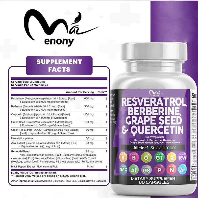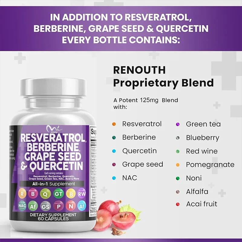 Advanced Resveratrol Supplement with Berberine Supplement - Our product takes Berberine Powder Extract and Resveratrol Nutritional Supplements and combines them with a Quercetin Supplement and Grapeseed Extract and the results are amazing. Normal Resveratrol Supplements contain smaller equivalent dosages like Resveratrol 1000mg, Resveratrol 2000mg, or Resveratrol 500mg. However, Clean Nutra has officially created an even more potent all in one polyphenols supplement. The All In One Grape Seed Extract Capsules & Berberine Supplements You've Been Looking For - Clean Nutra Renouth provides various full-dose products in one complex containing a full Resveratrol Berberine, Quercetin Supplements, Grapeseed Extract Capsules, Acai Extract, Noni Extract, Blueberry Extract, Alfalfa Extract, and Pomegranate in a convenient 2 capsule dosage. Finally, a stronger supplement than berberine 500mg, quercetin 500mg, or berberine 1000mg have been packed into one solution. Introducing the Renouth All In One Supplement - In addition to containing Grapefruit Seed Extract Capsules, our formula also contains a whopping equivalent of 6000mg of Quercetin Powder. This supplement could be a powerful alternative to Resveratrol Liquid, Berberine Tea, Grape Seed Oil, Quercetin Gummies and Resveratrol Gummies. Not your typical Resveratrol Serum, Quercetin 1000mg, Berberine 1500mg, Trans Resveratrol Supplement or Berberine HCL. A Powerful Resveratrol Maximum Strength with - Renouth is overflowing with potent resveritrol supplements and much more such as Red Wine Extract, NAC or N-Acetyl Cysteine, and Black Pepper Extract to help with absorption. Clear out those countless quercetin 500mg capsules, berberine tea, grape seed oil for skin, and resveratrol 400mg and enjoy an all inclusive supplement from Clean Nutraceuticals. Vetted and Trusted Ingredients - We pride ourselves in offering a quality supplement that combines the benefits of grape seeds, a quercetin with nac supplement n-acetyl cysteine and more. Our formulas are proudly made in a registered and certified facility. Many products offer only a few ingredients like trans resveratrol 1000mg and resveratrol 1000mg organic. However, these all-in-one capsules contain much more.