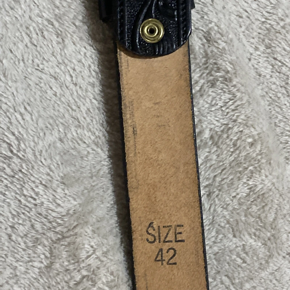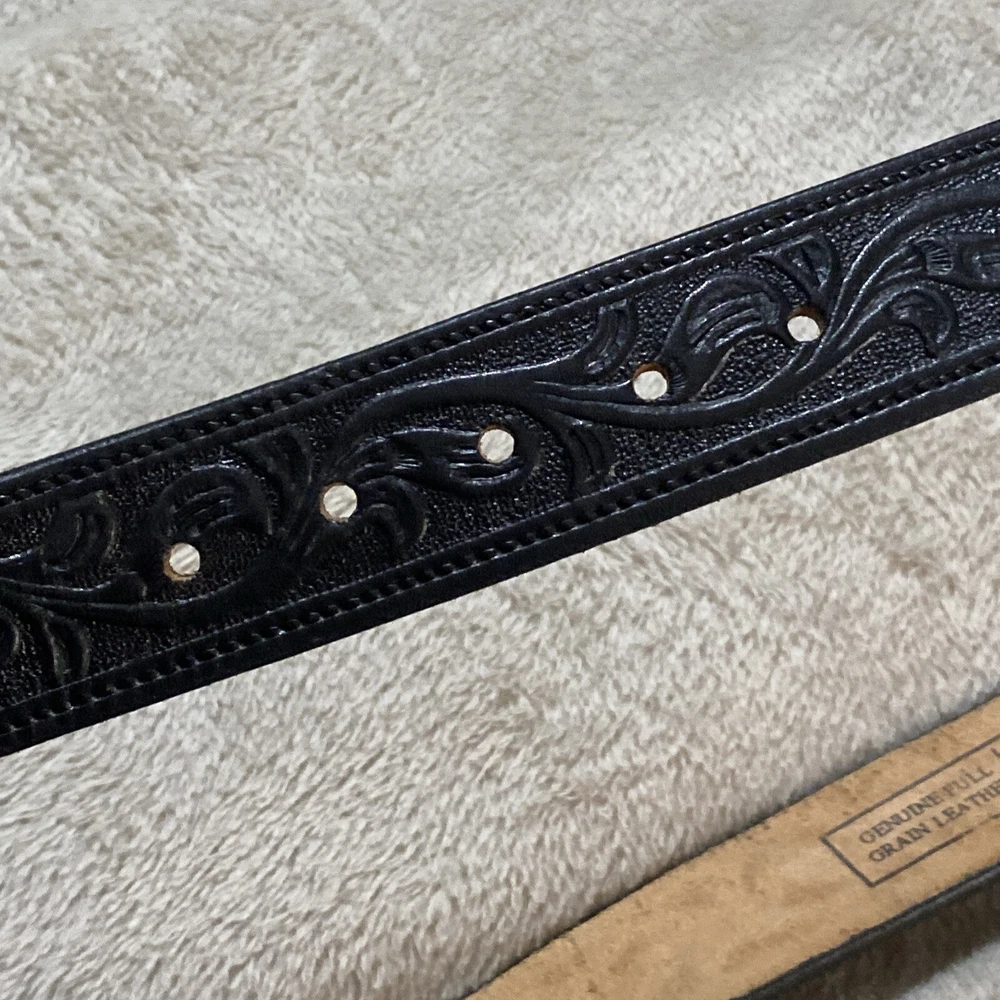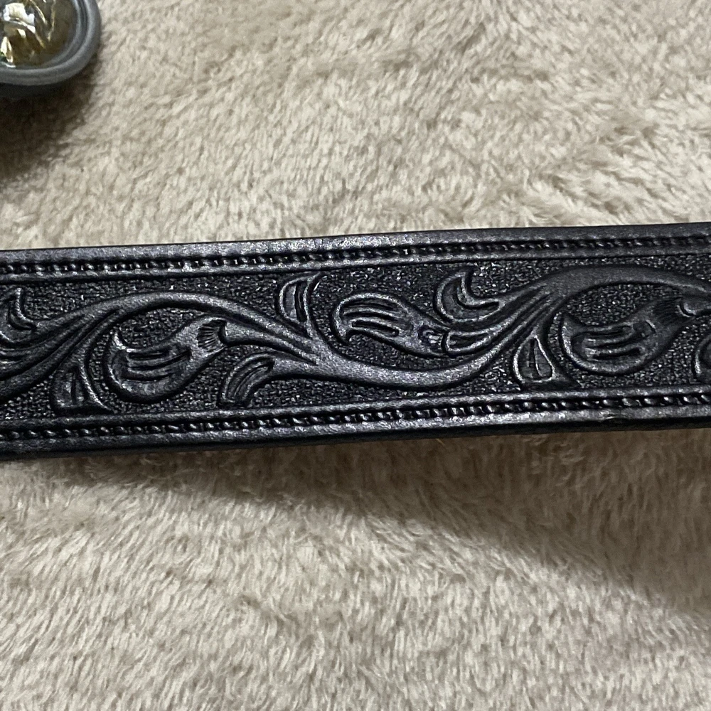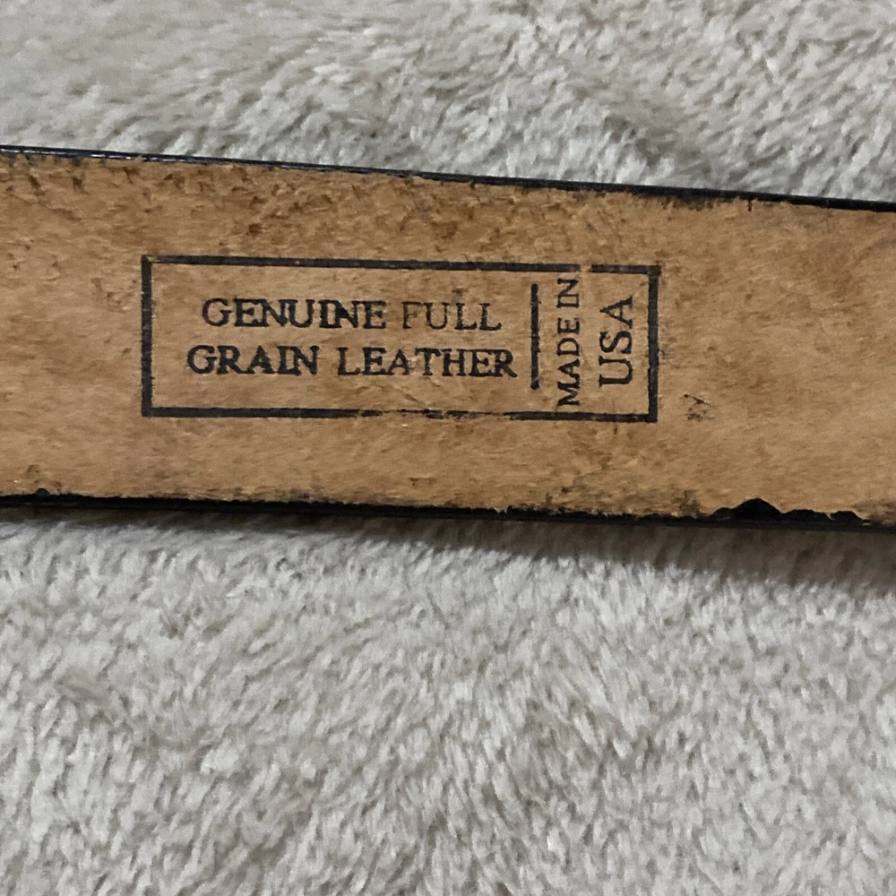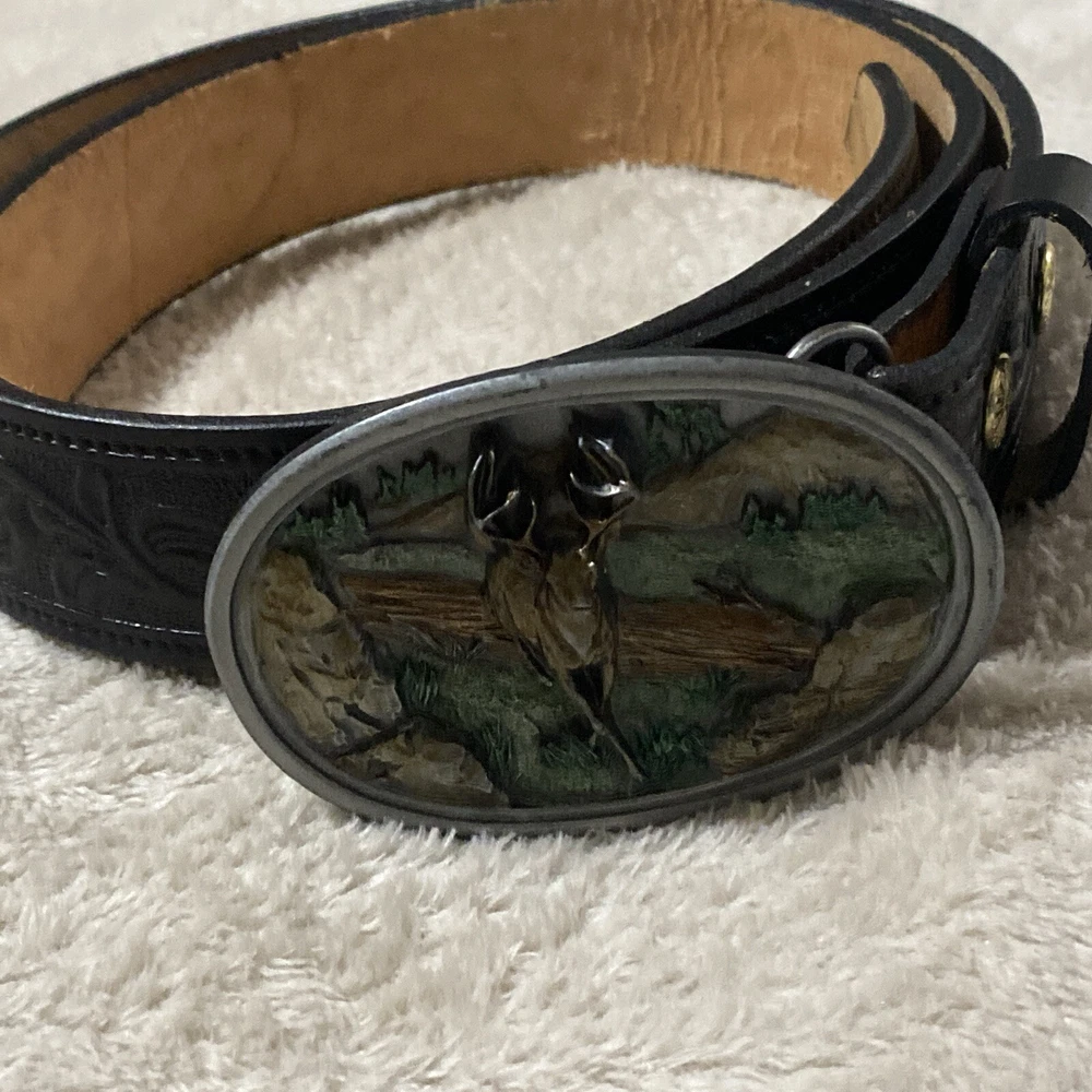 This is a vintage Bergamot Brass Works belt buckle made in 1983. The buckle features a pewter deer theme with enamel accents. This belt buckle is a great addition to any collection and is perfect for men who love hunting or the outdoors. Along with the buckle is a size 42 vintage hand tooled genuine full grain leather black belt in like new condition. Made in USA. No stress to any of the buckle holes. Excellent vintage condition.