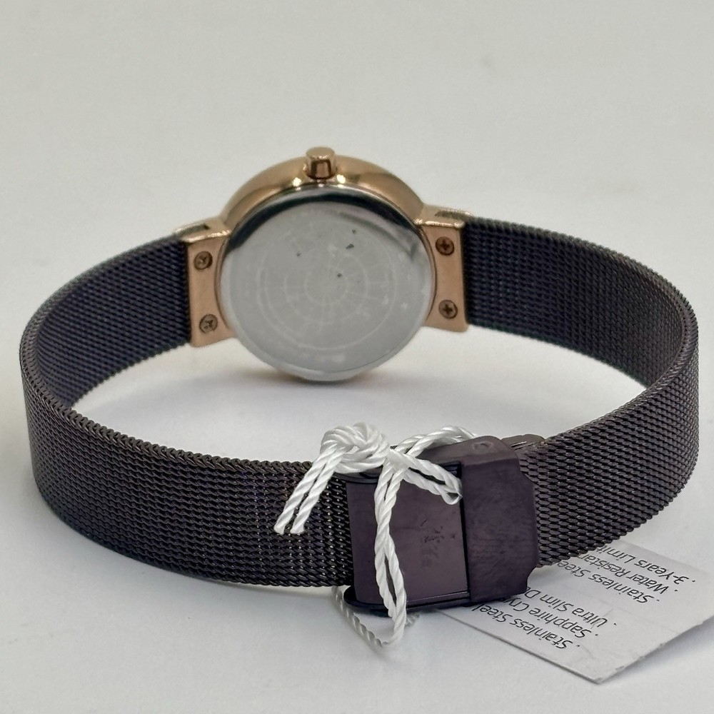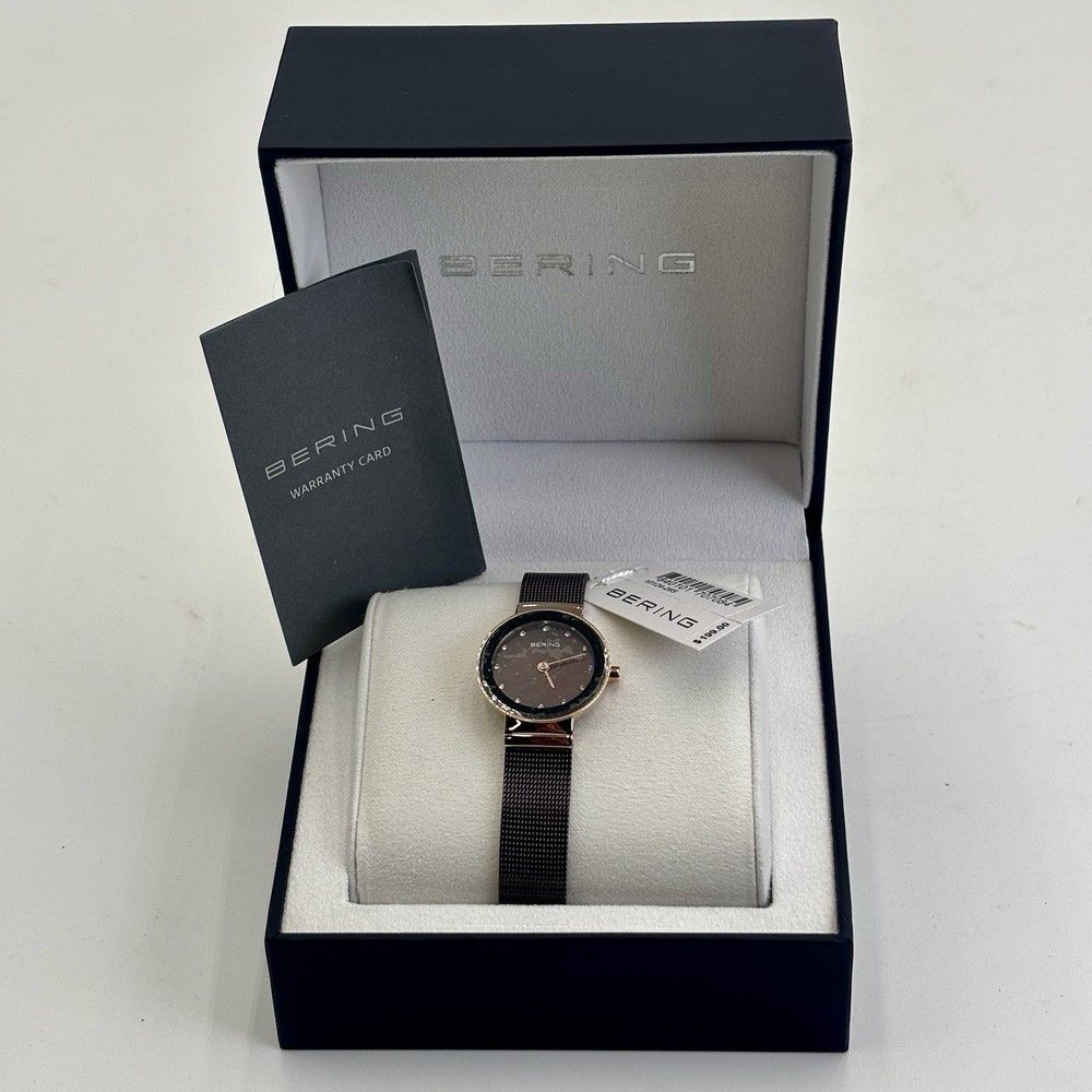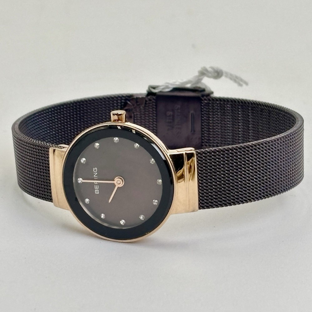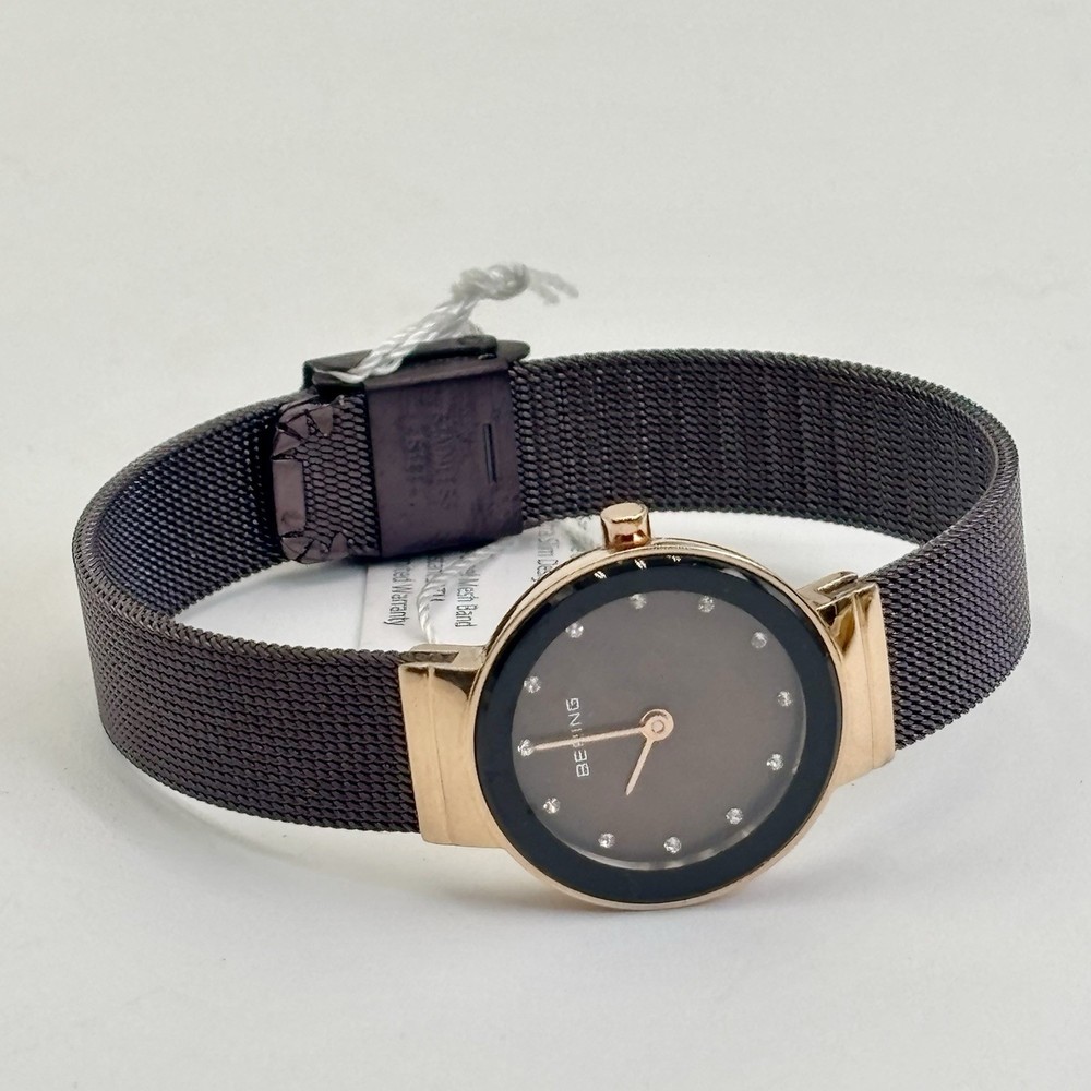 The Bering Women's Classic Stainless Steel Brown Milanese Mesh Watch is a stylish and elegant timepiece designed for women. Featuring a sleek stainless steel case with a gold color, This watch boasts diamond markers on its 12-hour dial and a scratch-resistant sapphire crystal. The brown Milanese mesh band adds a touch of femininity to this classic and sophisticated watch, making it the perfect accessory for any occasion. With a quartz movement and anchor escapement, this watch is reliable and precise, making it a timeless piece for any jewelry collection.